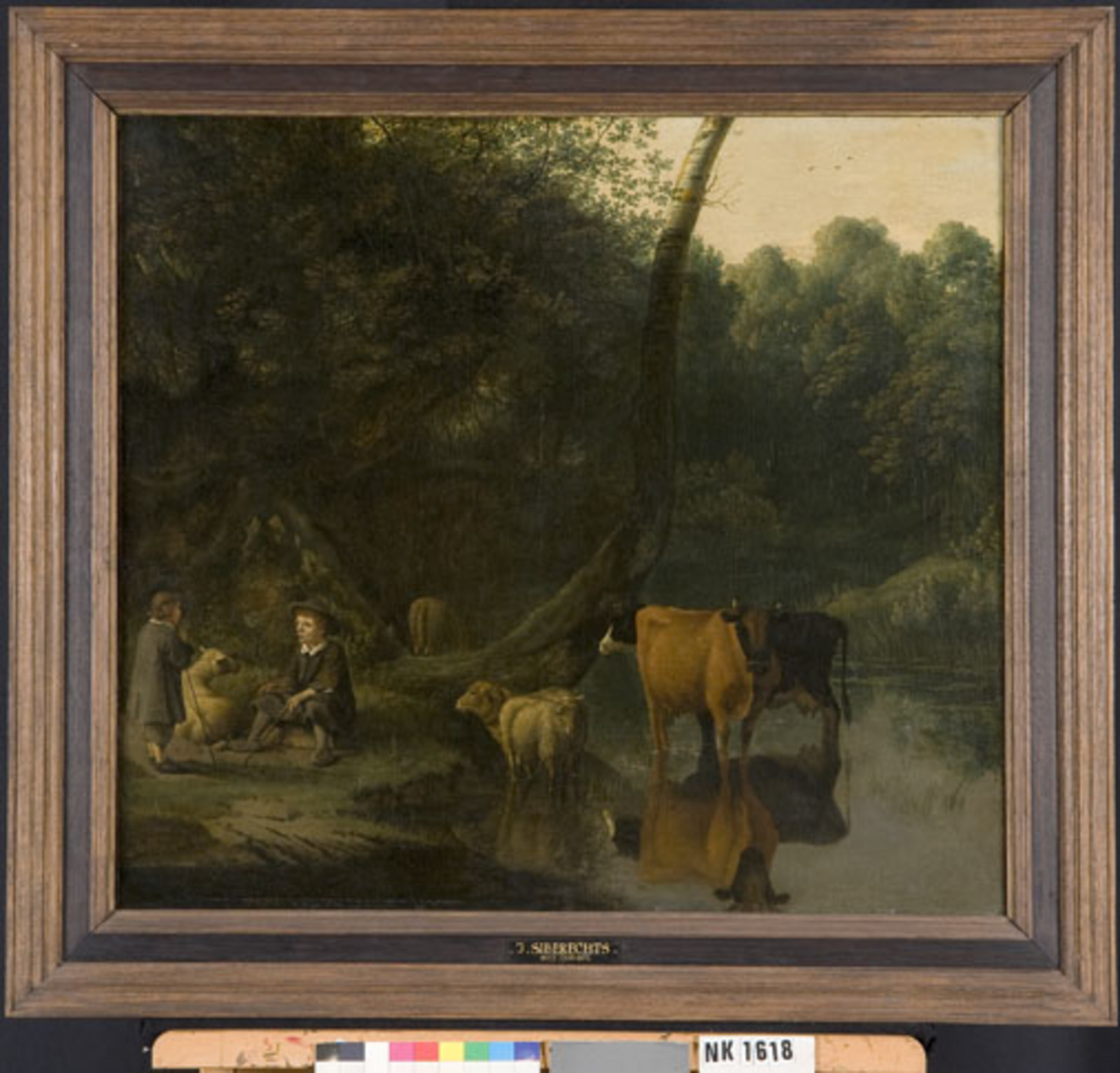 Twee herders met koeien en schapen bij een drinkplaats