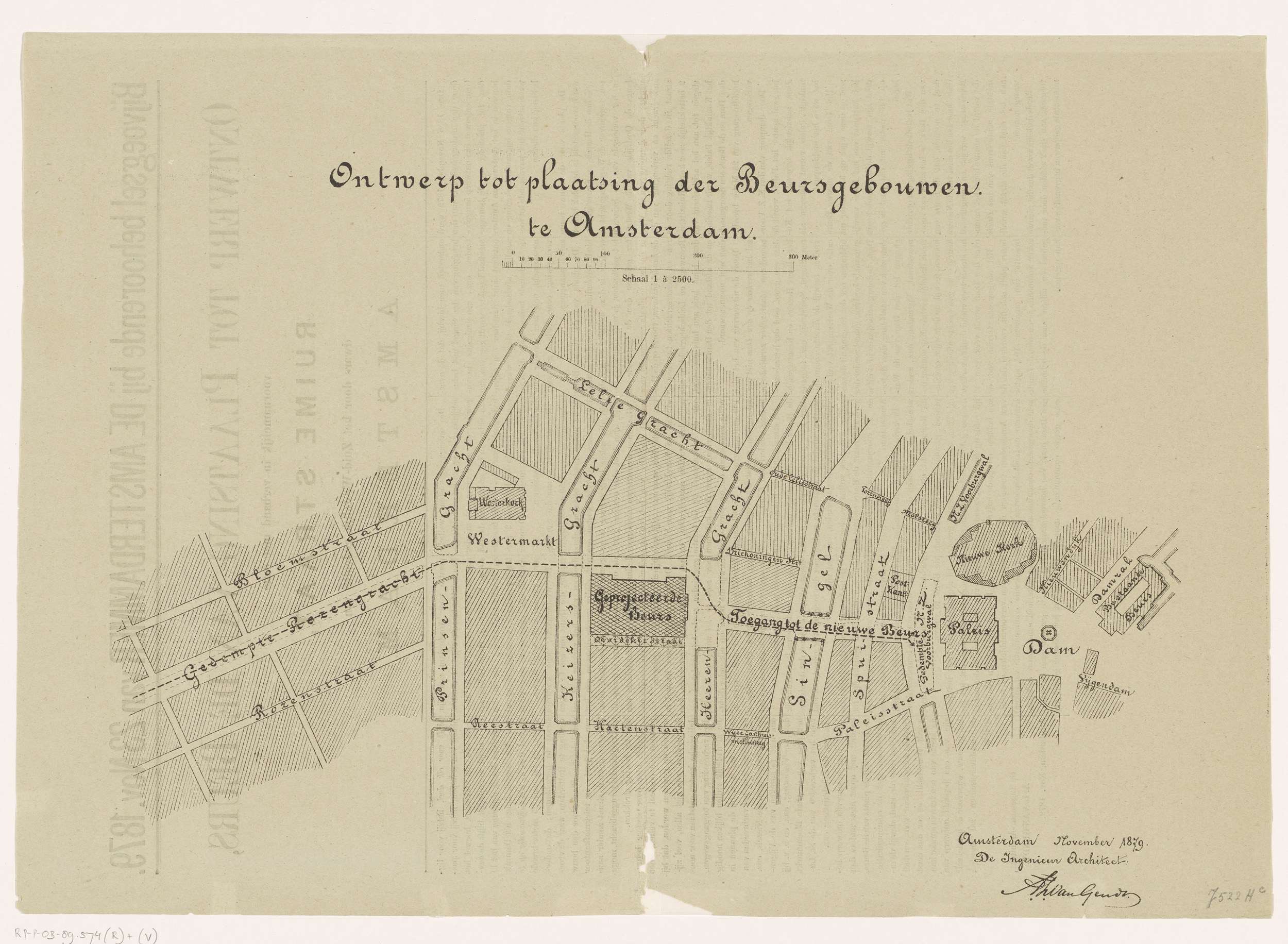 Plan voor een nieuw beursgebouw aan het Damrak, 1879