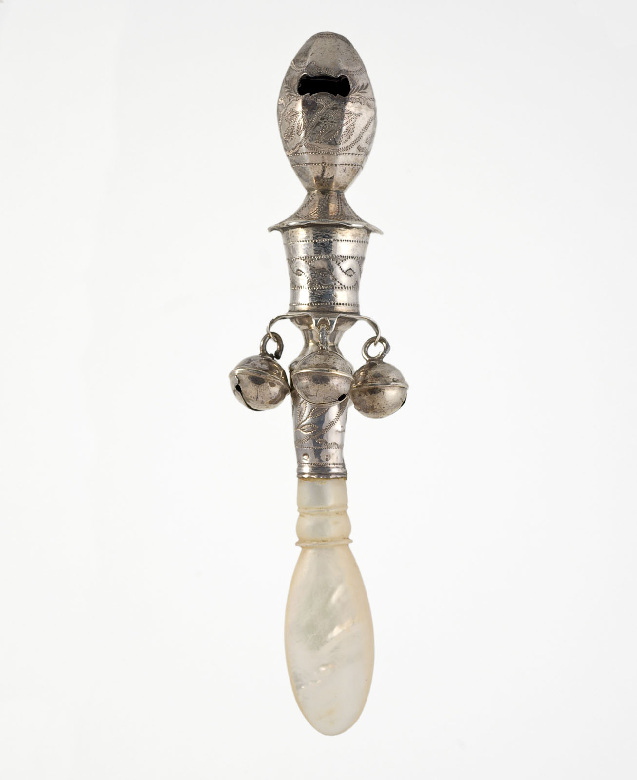 Zilveren George III rammelaar met fluitje en handvat...