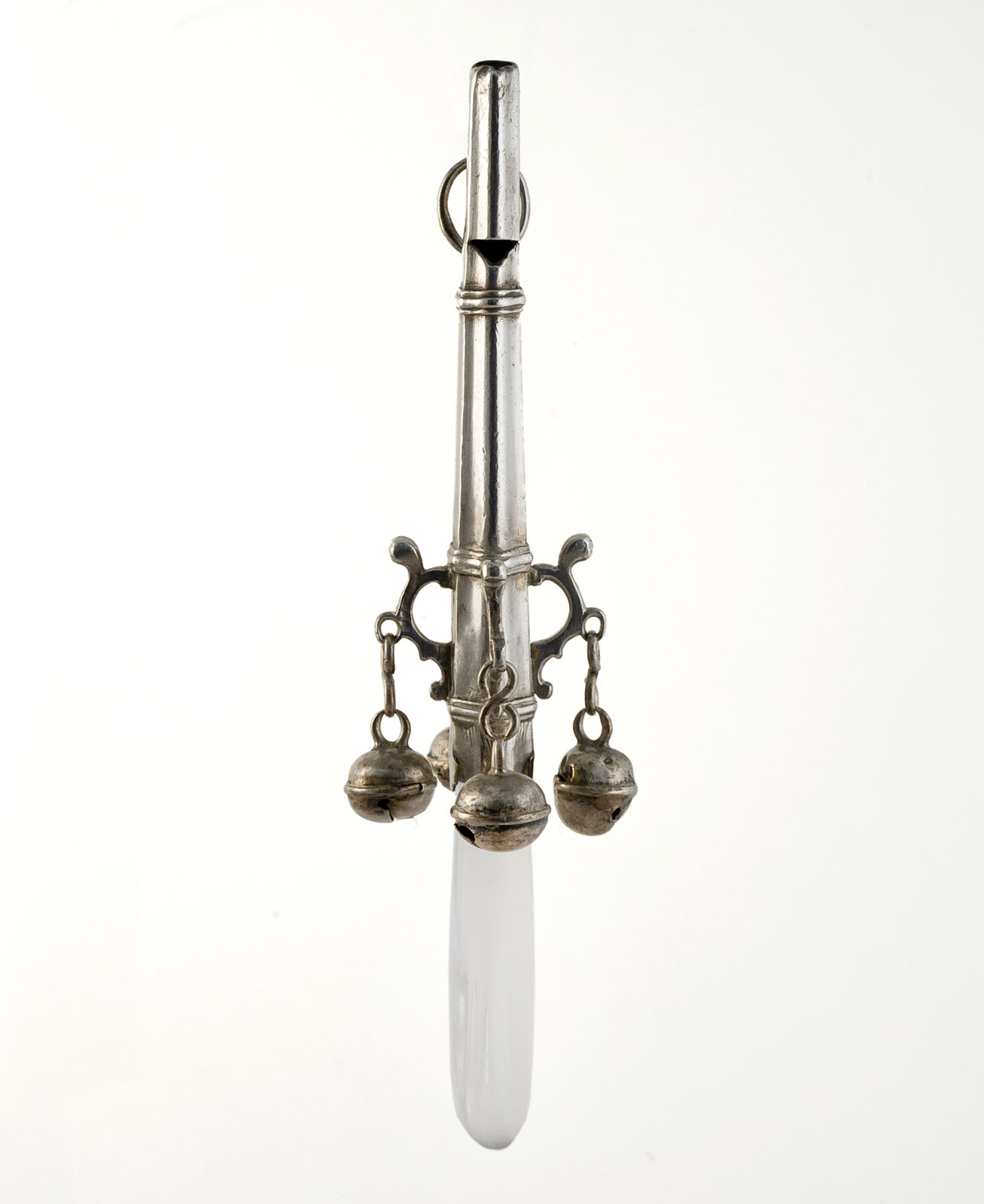 Zilveren rammelaar met fluitje en bijtstuk van kristal