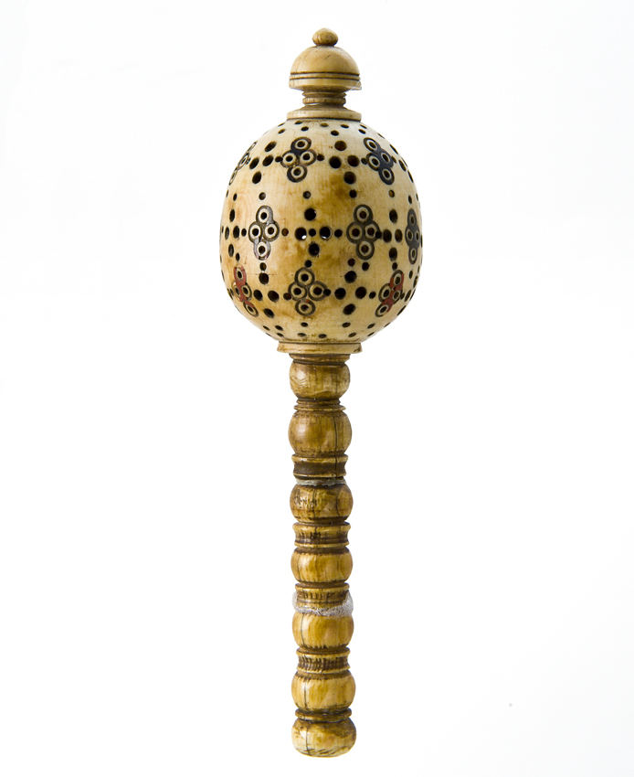 Opengewerkte, ivoren rammelaar met handvat met gesne...