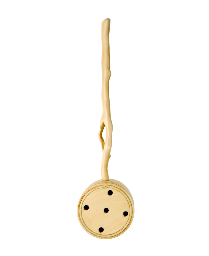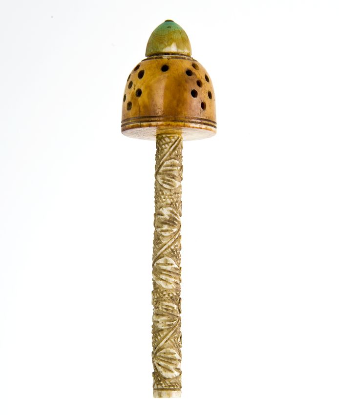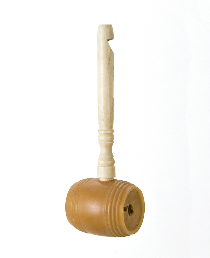 Tonvormige miniatuur rammelaar van ivoor en been met...