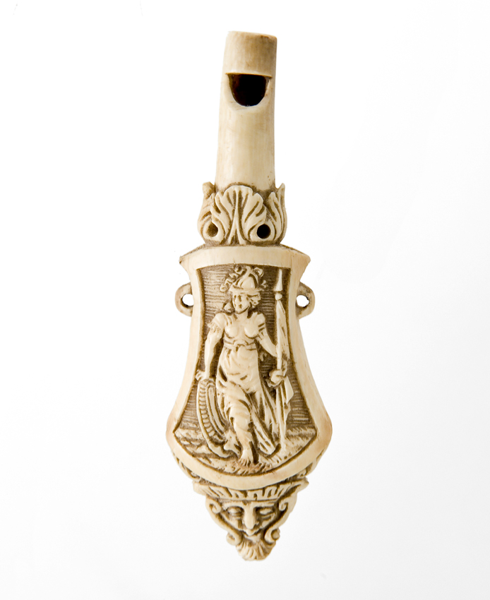 Ivoren rammelaar met gesneden figuur van Athena