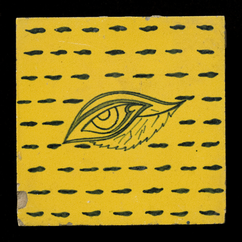 Tegel in tinglazuur, voorstellende blad met oog, ver...