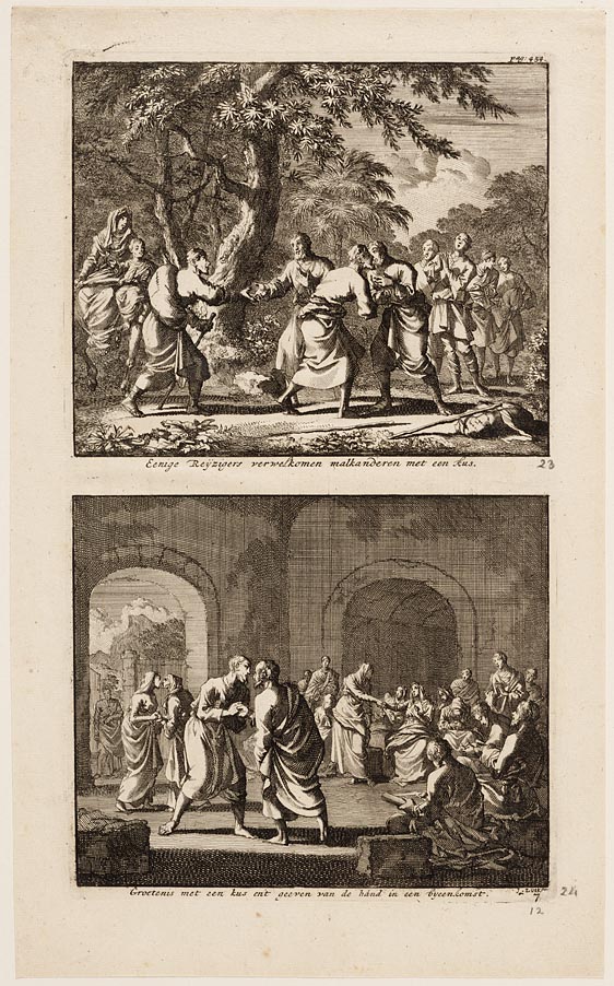 Eenige reijzigers verwelkomen malkanderen met een ku...