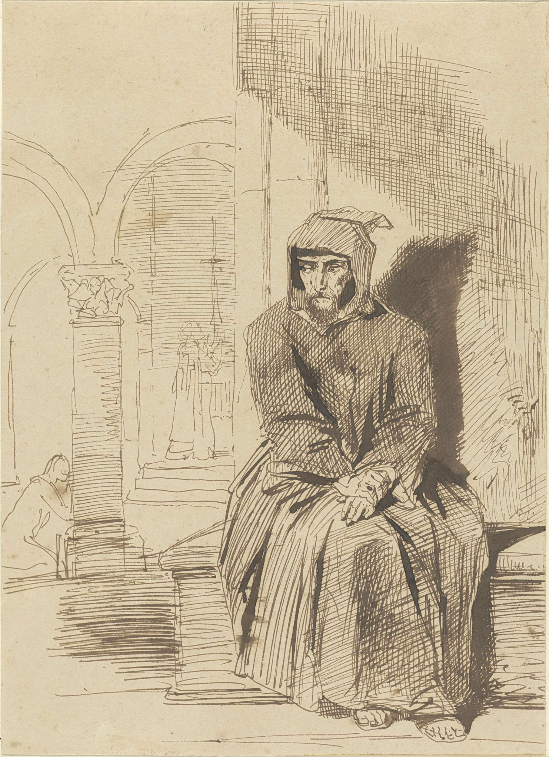 Zittende monnik, in overpeinzing, terwijl op de acht...