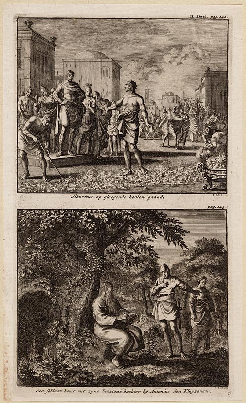 Tiburtius op gloeyende koolen gaande, Een soldaat ko...