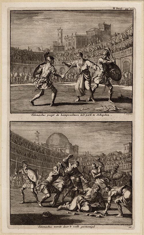 Telemachus poogt de kampvechters in ´t perk te schey...