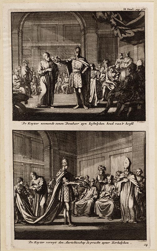 De keyzer neemende eenen domheer zyn kostelyken hoed...