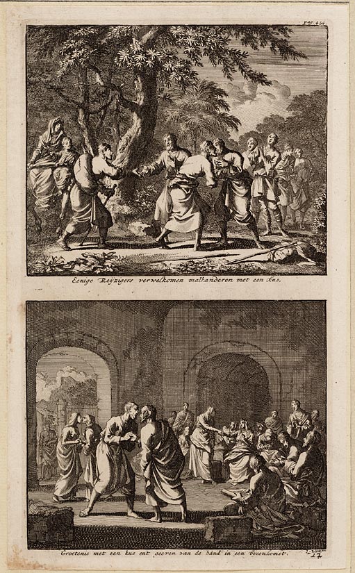 Eenige reijzigers verwelkomen malkanderen met een ku...