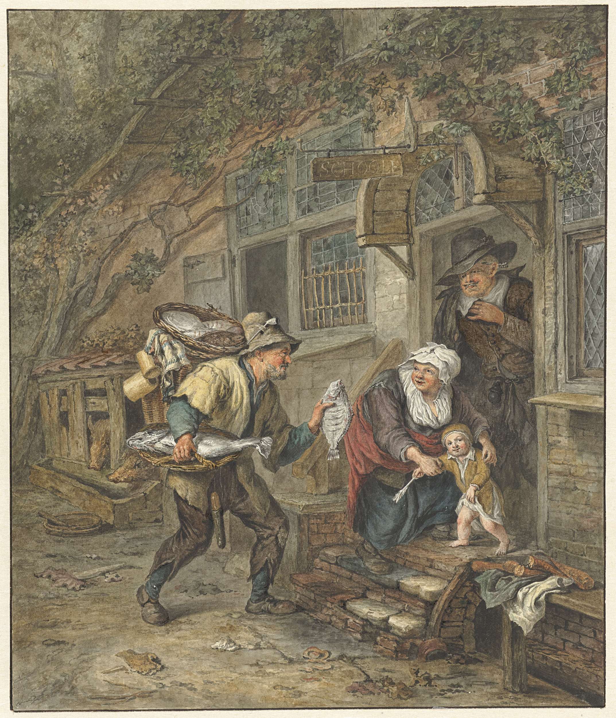 Een visverkoper biedt een schol aan aan een schoolme...