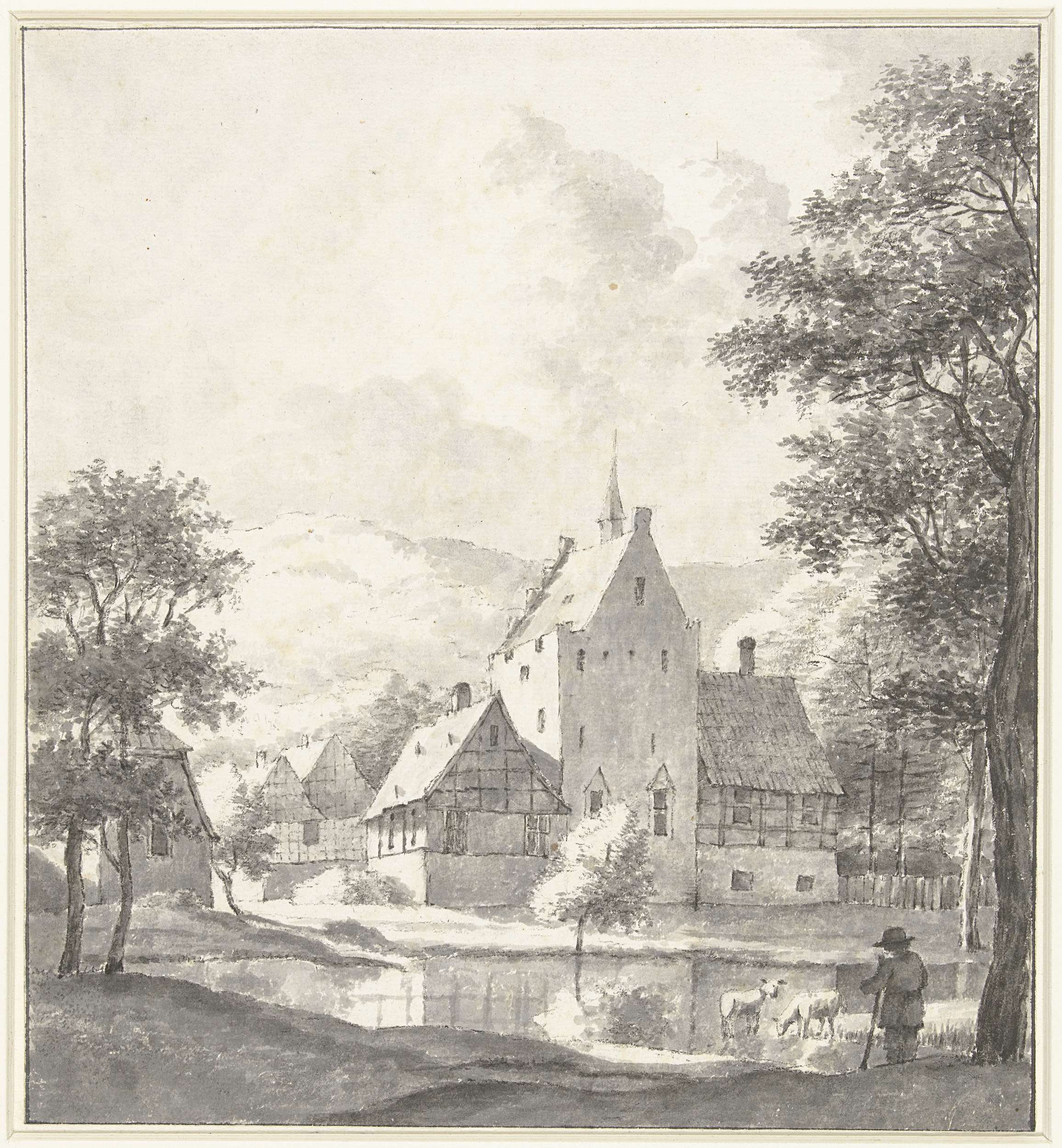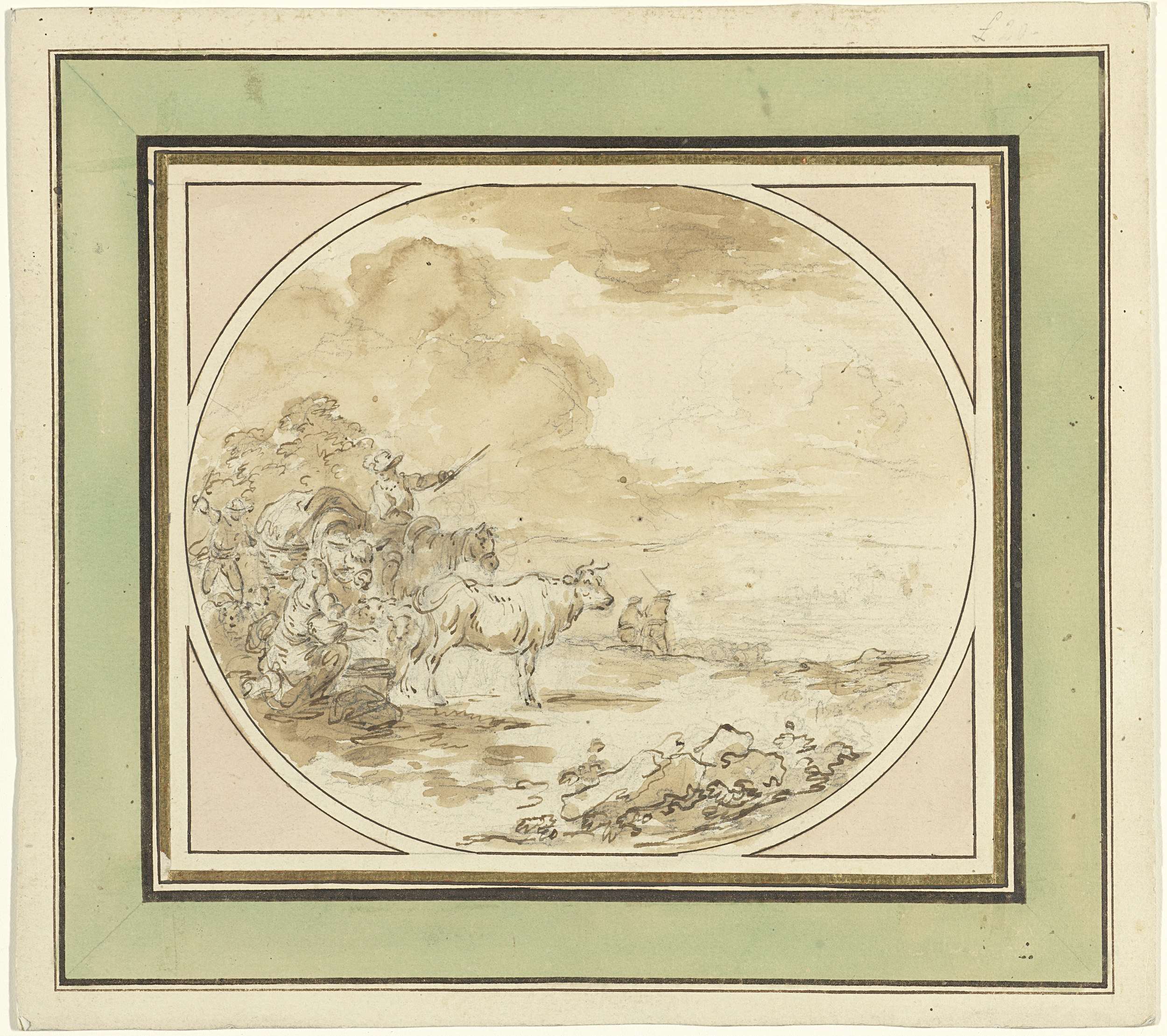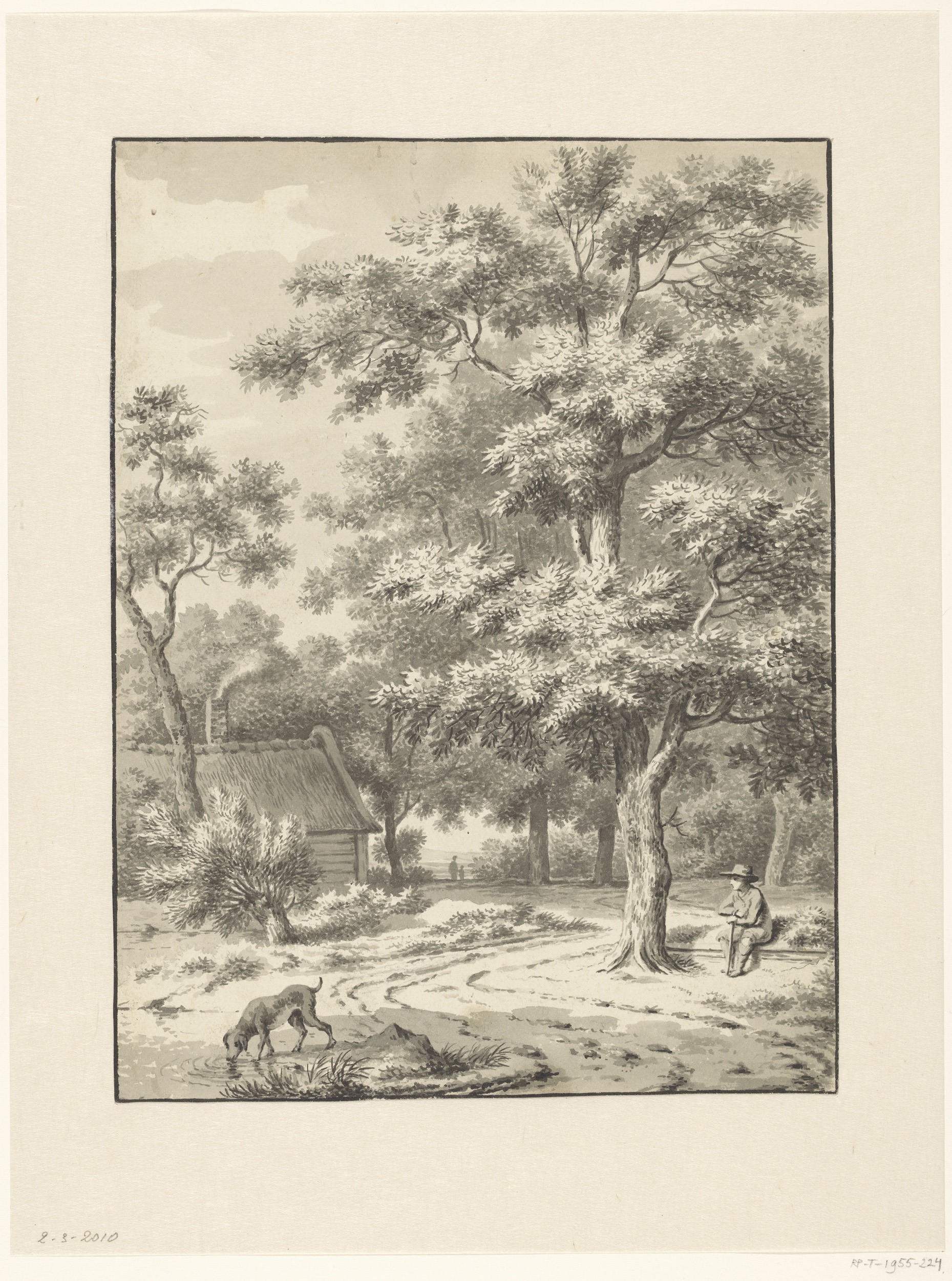 Landschap met rustende wandelaar en een hond die wat...