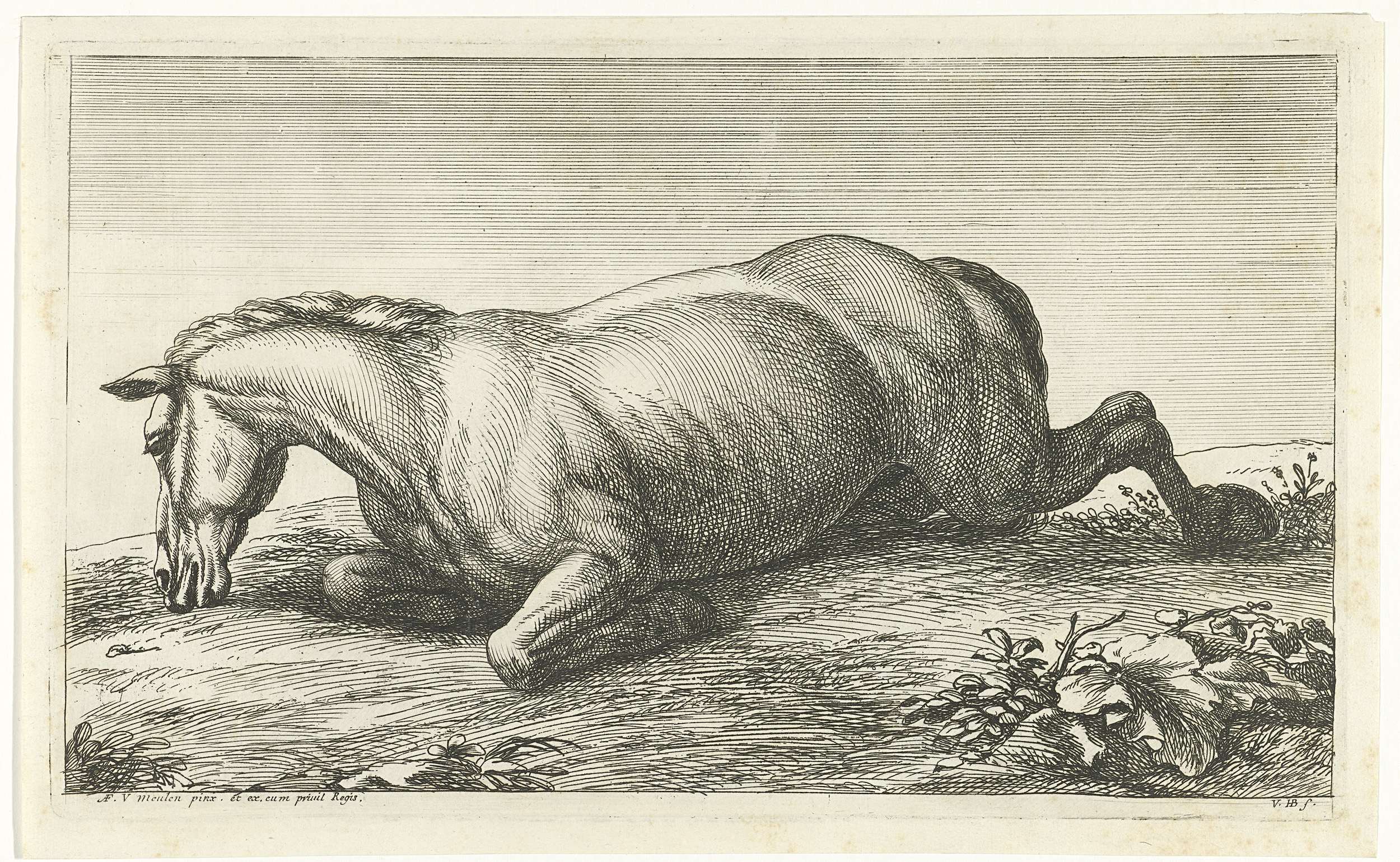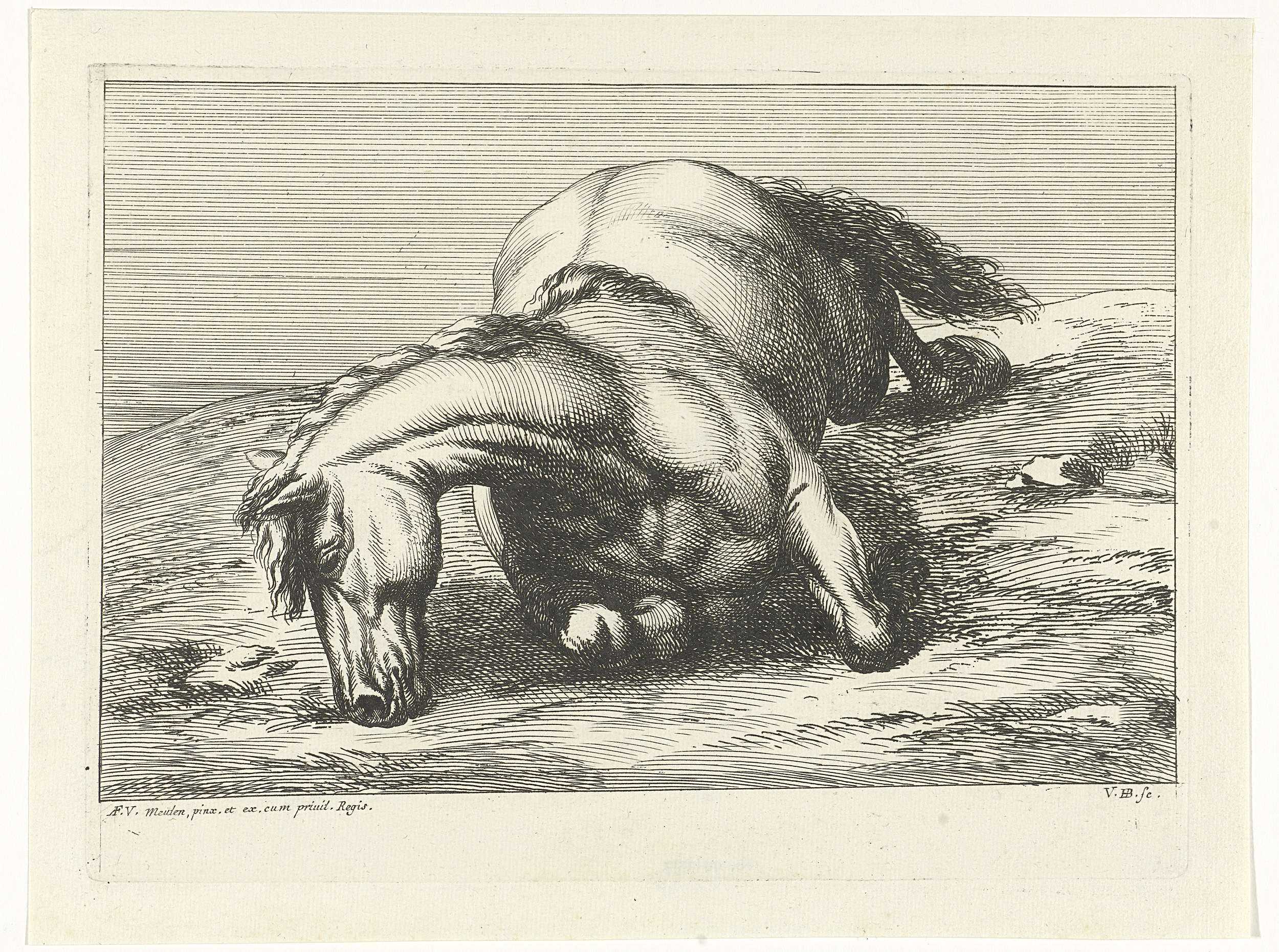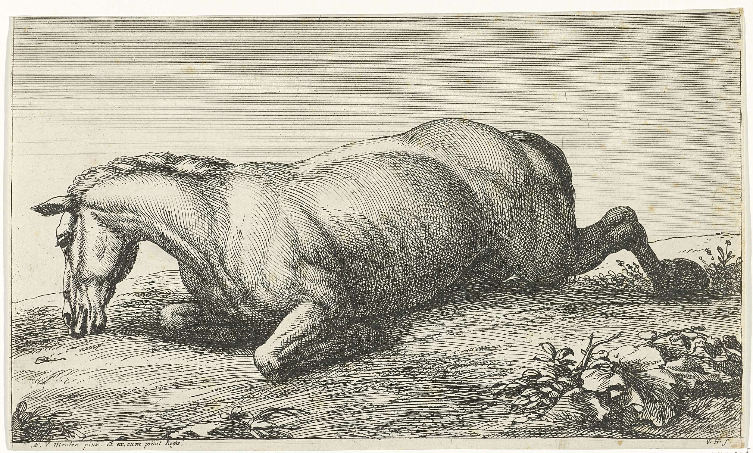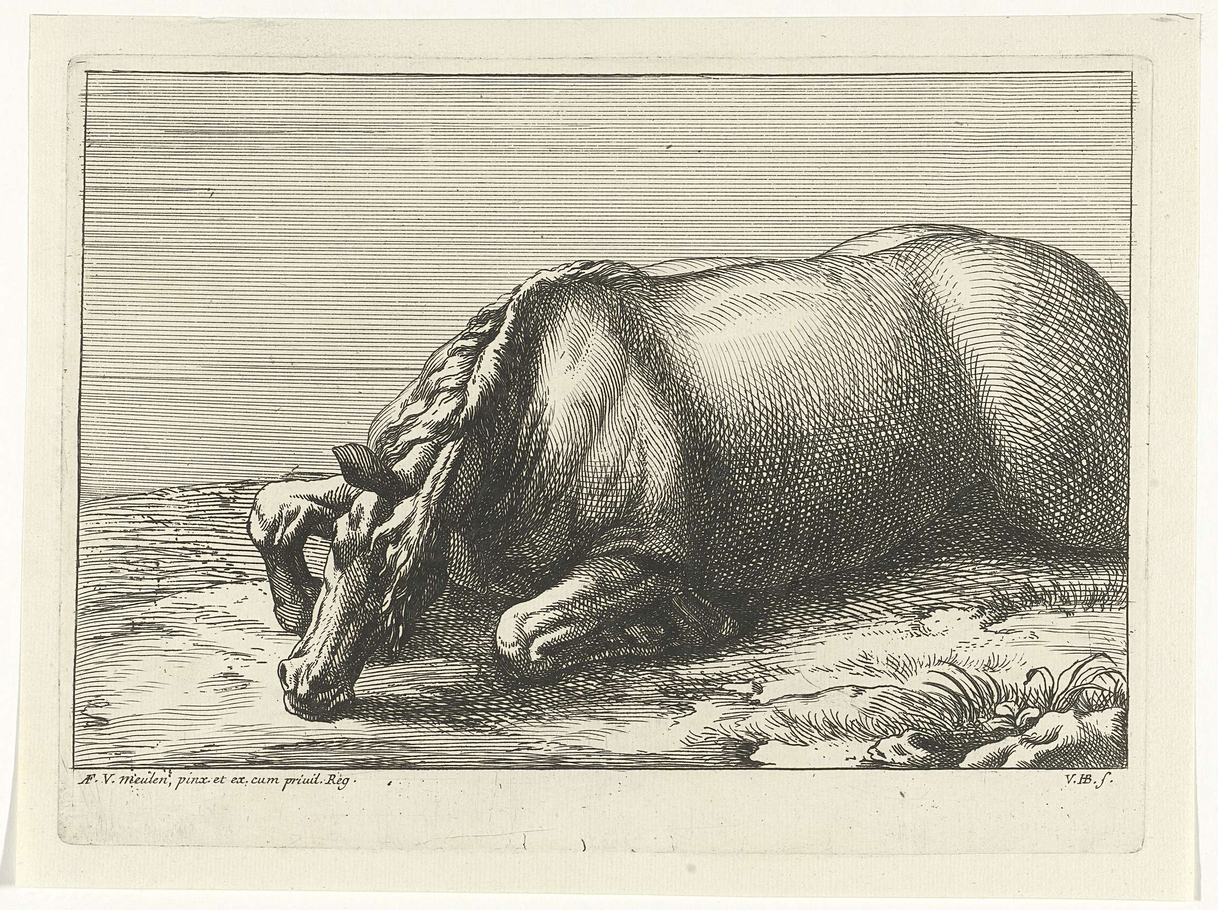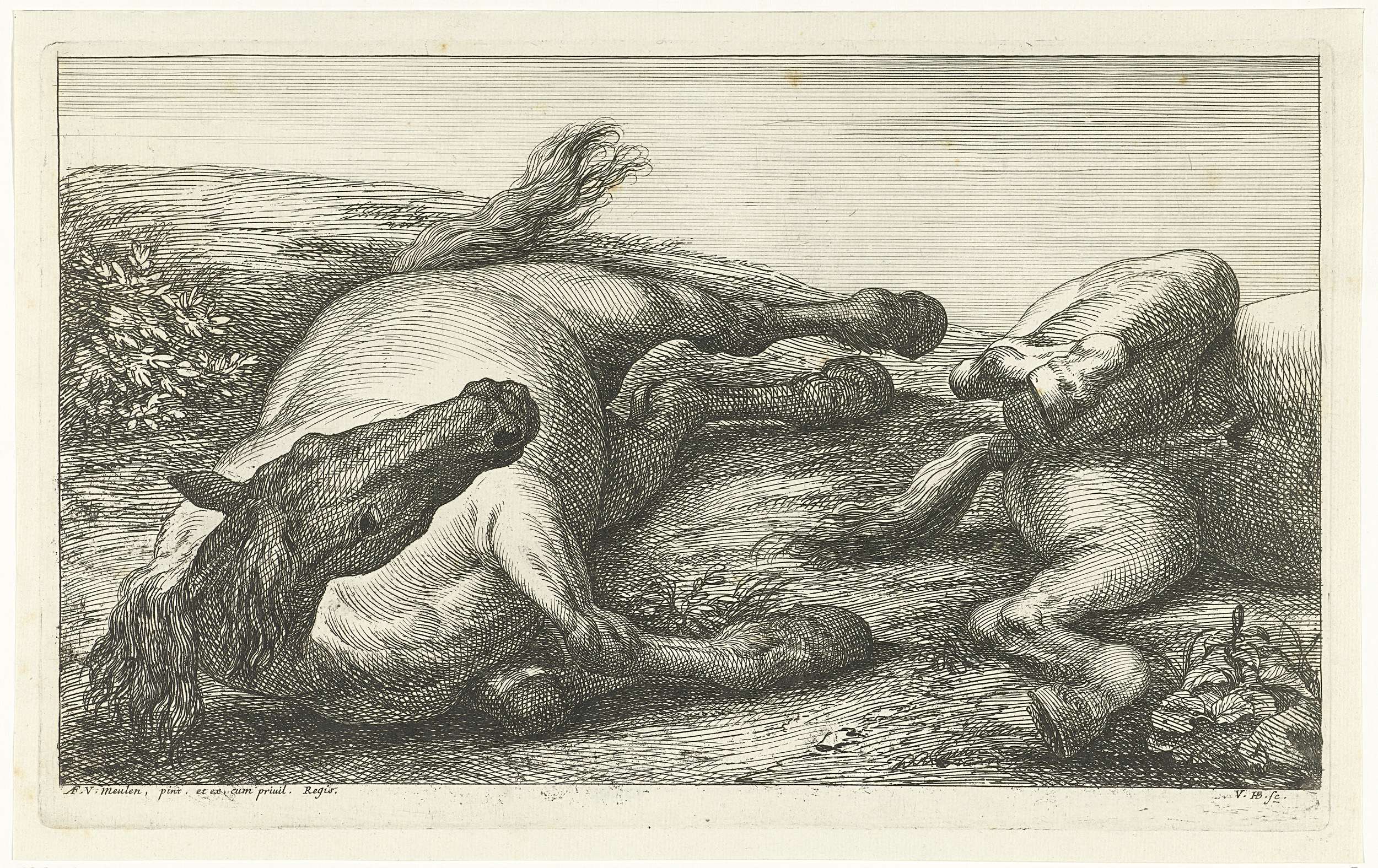 Twee gesneuvelde paarden waarvan de rechter van de z...