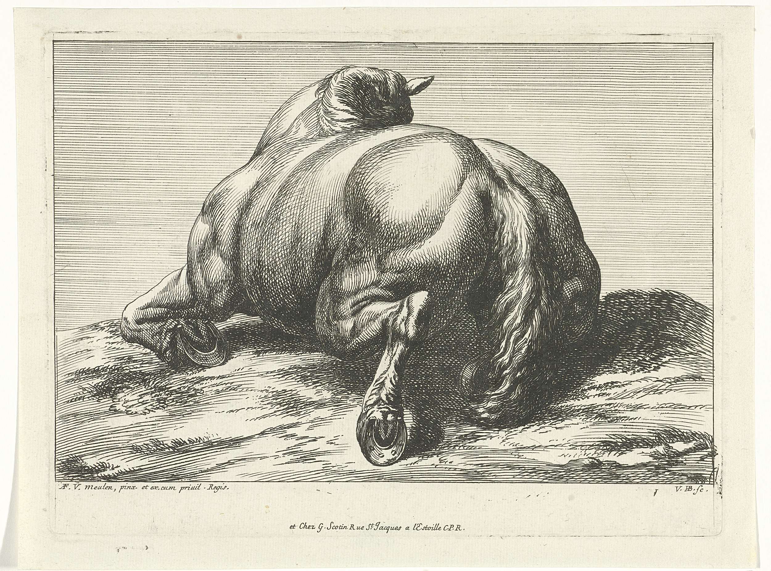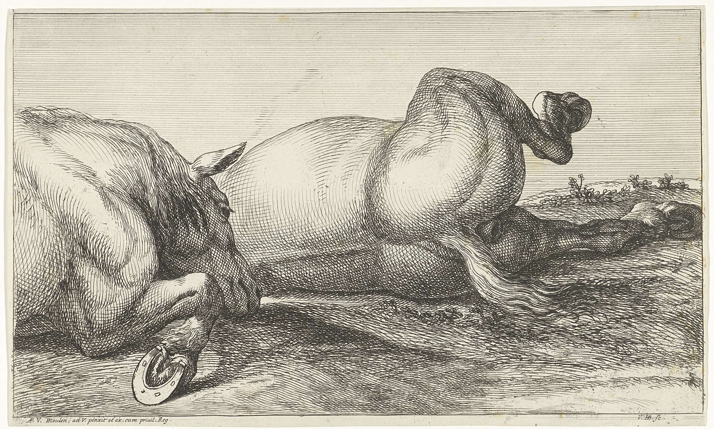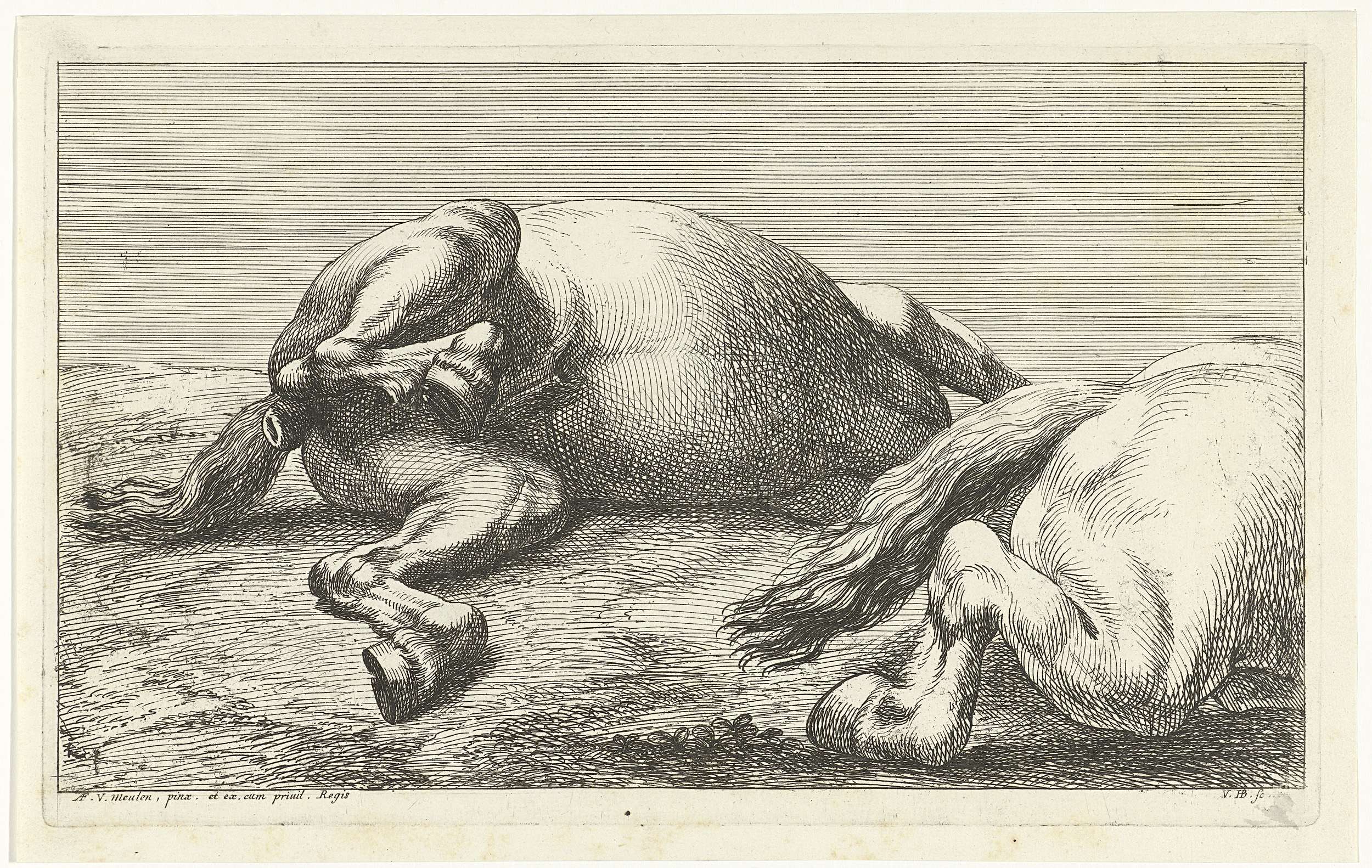 Twee gesneuvelde paarden waarvan de linker van voren...