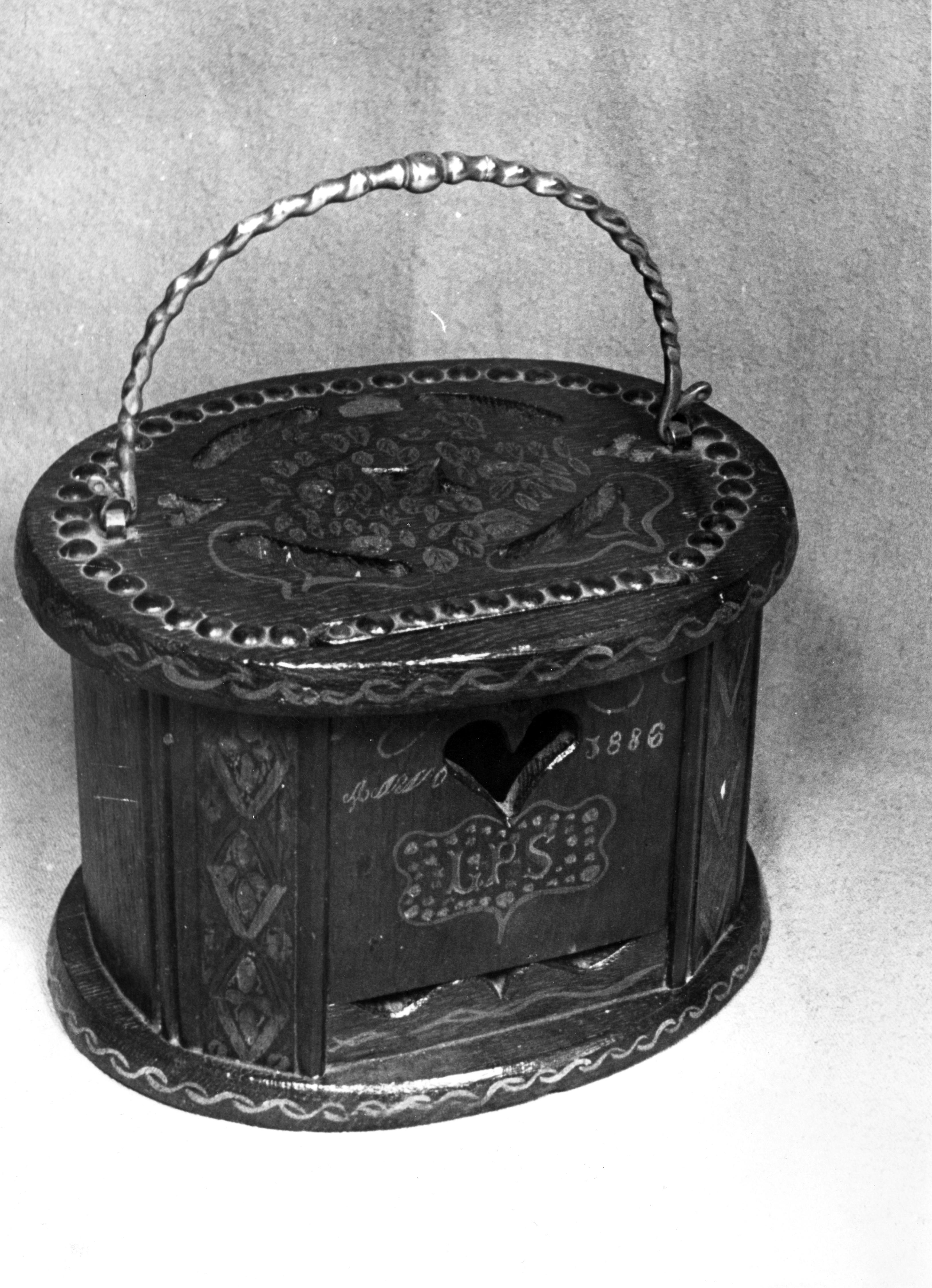 Beschilderde spanen doos, Marken, 1943 (zwart-wit foto)