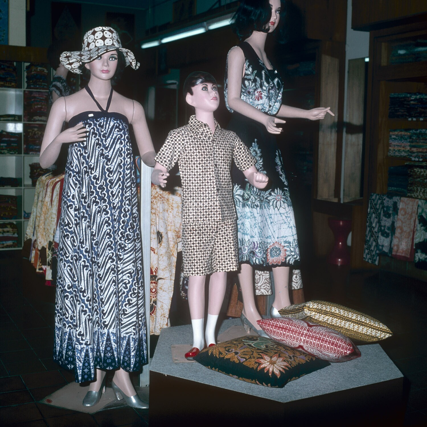 Een display van diverse batiks, Jogja.