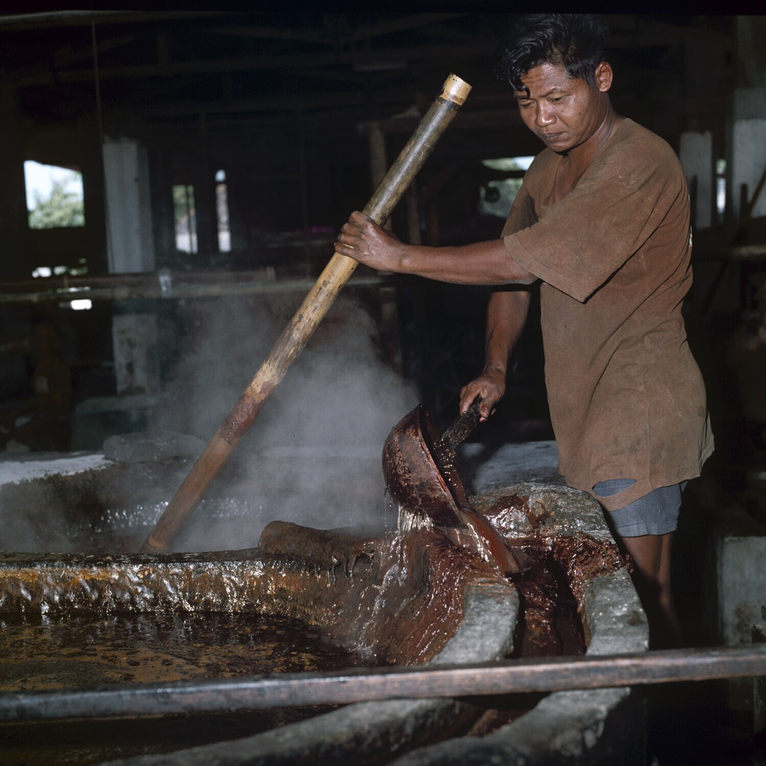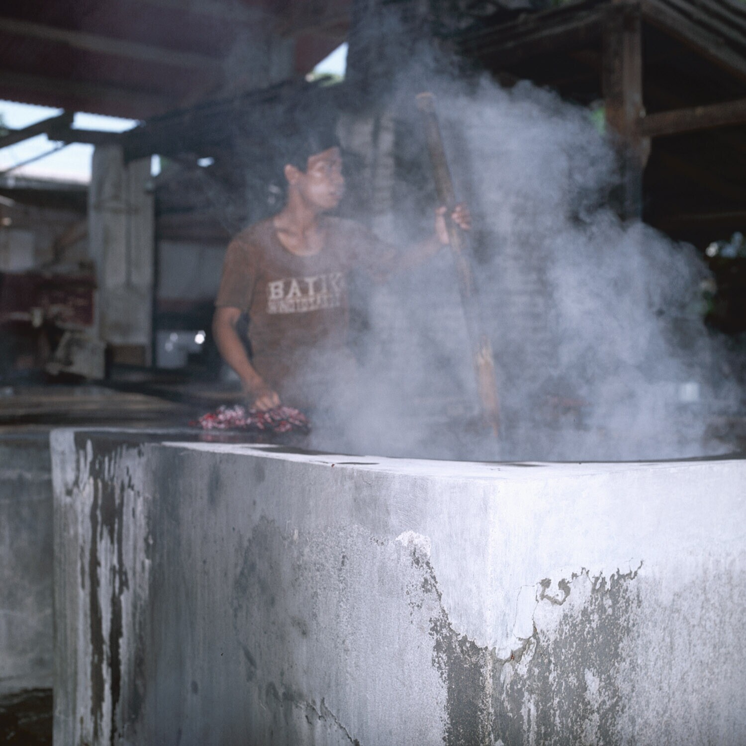 Batikatelier, Jogja. De was wordt geverfd.