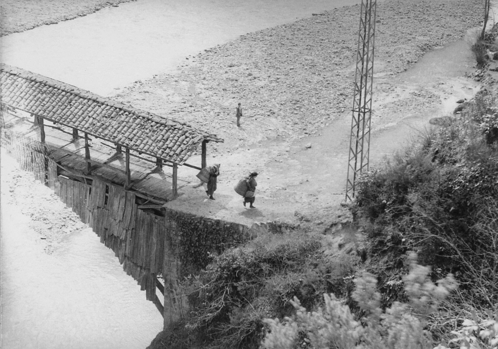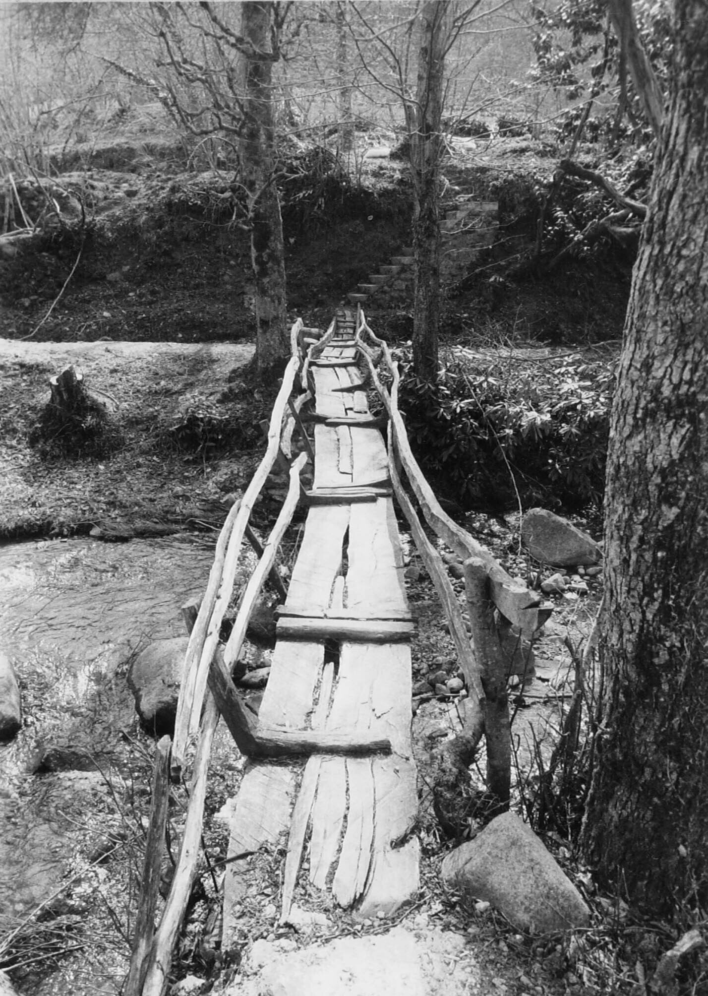 Een overdekte hangbrug, als bescherming tegen de sneeuw