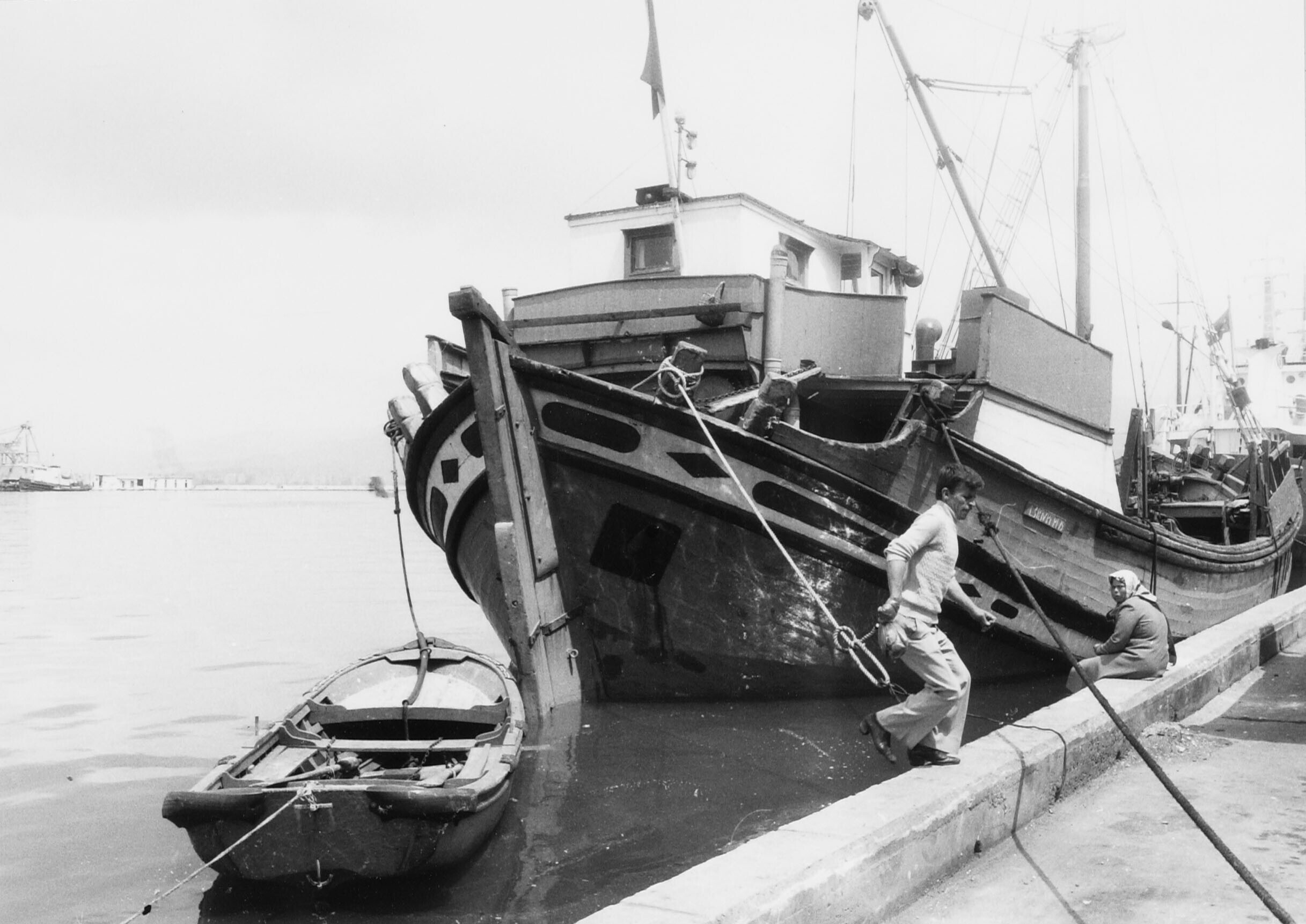Achtersteven van een houten vrachtboot in de haven