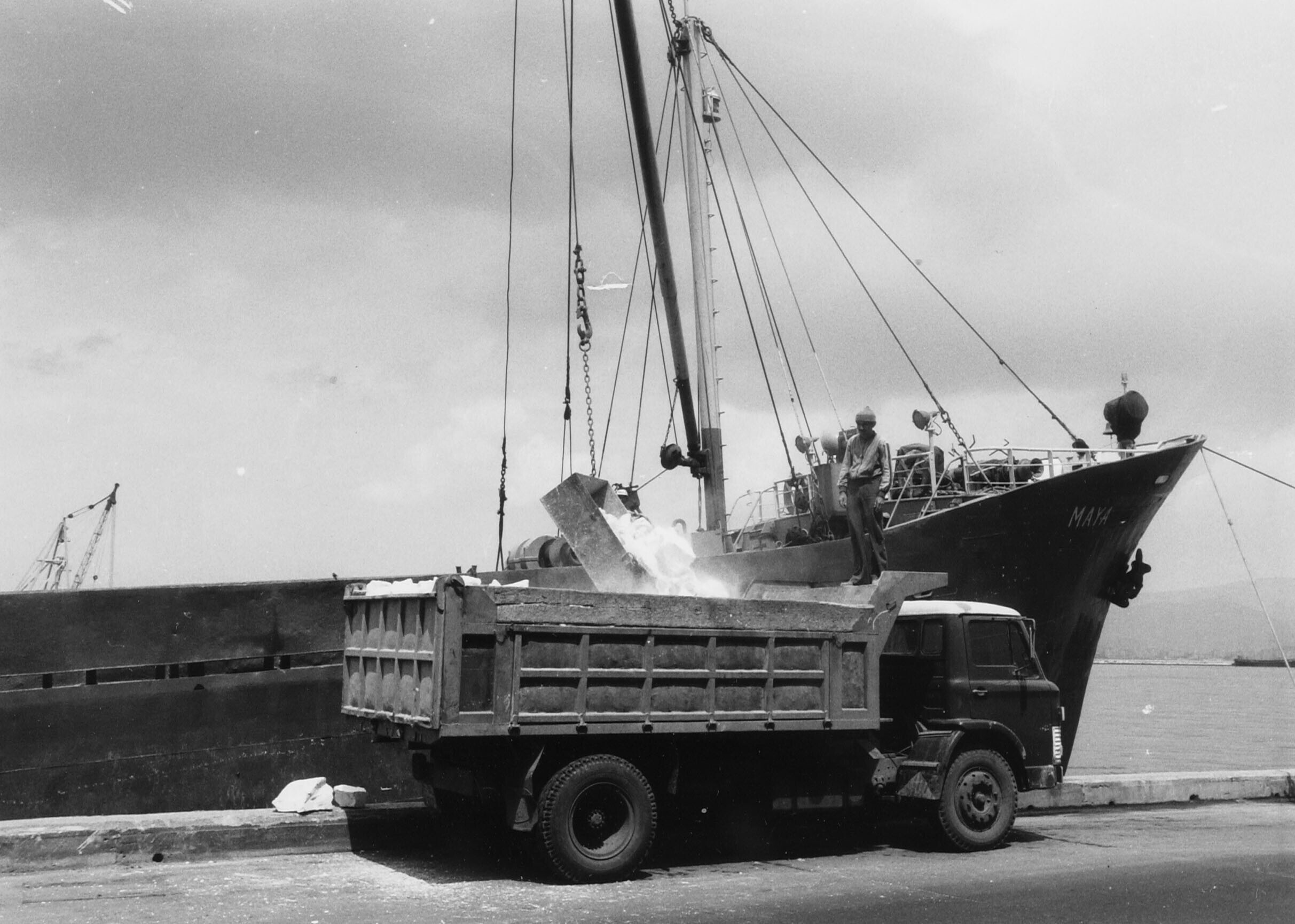 Het laden van kalksteen in een vrachtauto in de haven