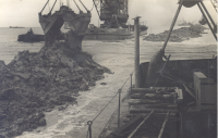 Kranen, keileemschuiten en sleepboot bij het sluitga...