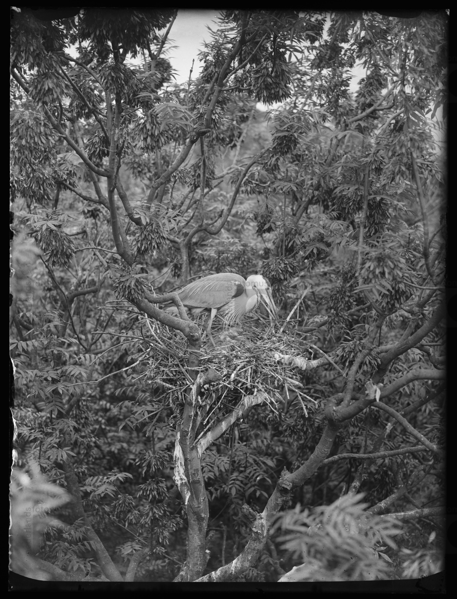 Blauwe reiger werkt nest bij, met jongen erin, Slote...