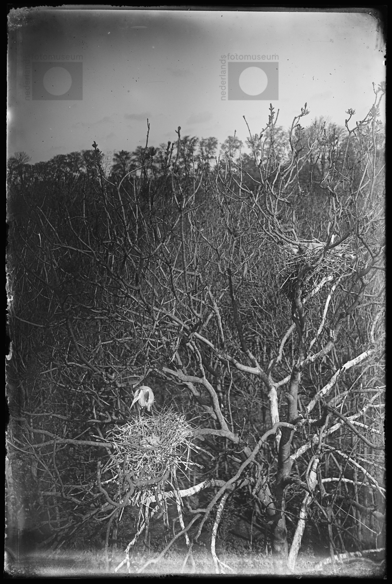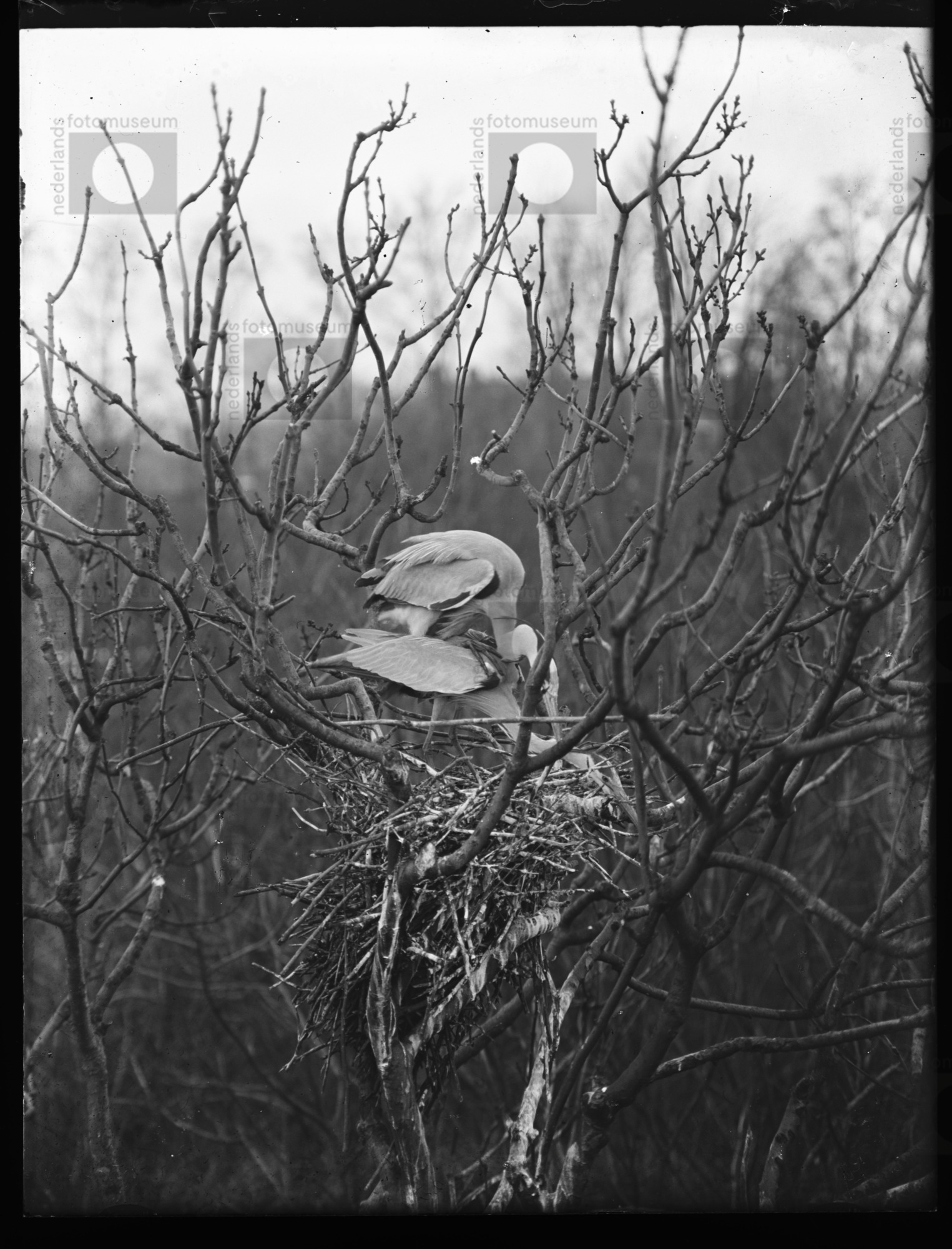 Blauwe reigers bij/op nest in broedkolonie, Sloten, ...