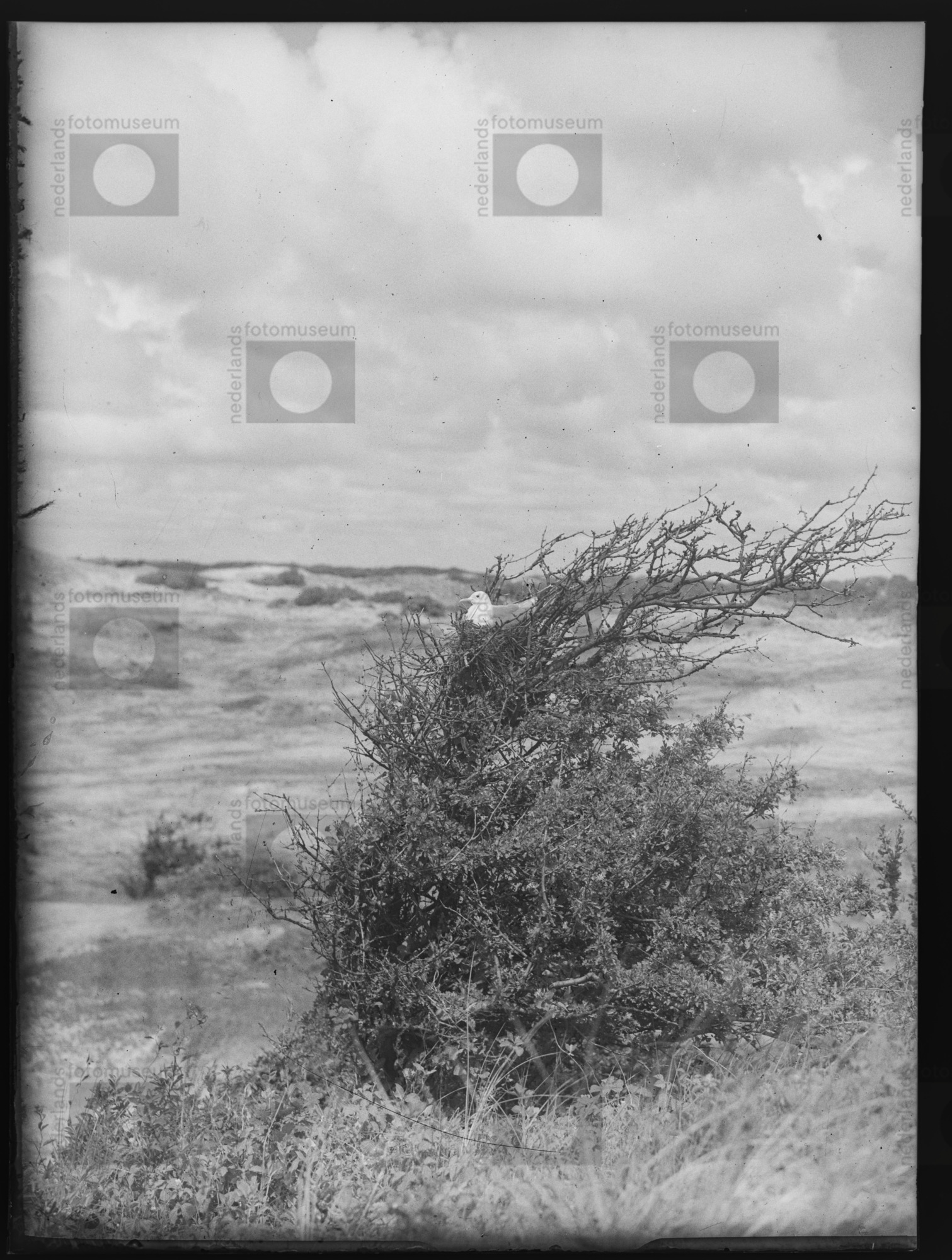 Stormmeeuw broedend in meidoorn, Bergen (1948)