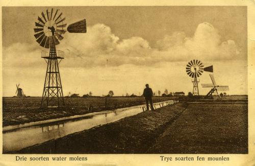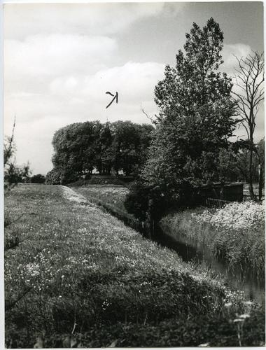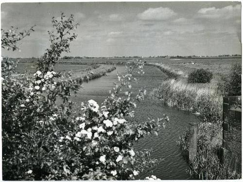 Foto in zwart-wit van een poldervaart met weilanden ...