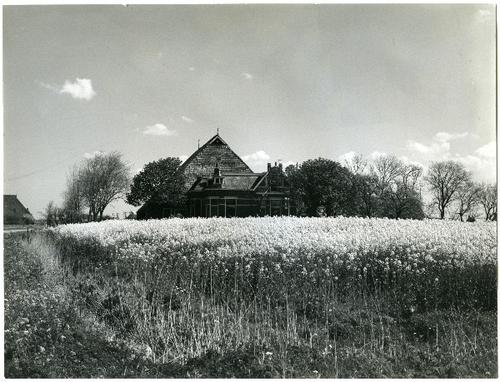 Foto in zwart-wit van twee boerderijen met bijgebouw...
