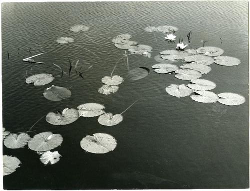 Foto in zwart-wit van bloeiende waterlelies door J.D...