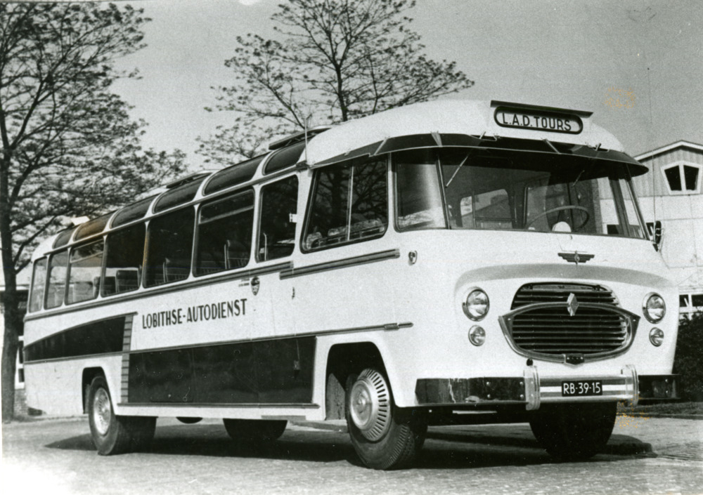 Zwart-wit foto van een autobus van de Lobithse Autod...
