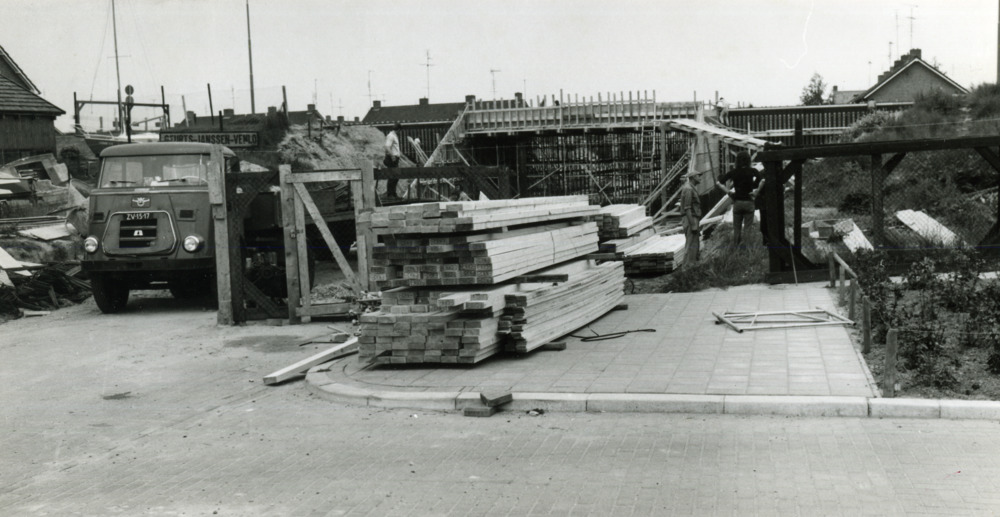 Zwart-wit foto van de bouw van een tunnel te Lobith....