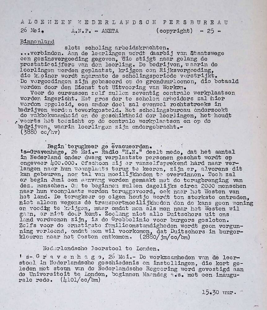 Algemeen Nederlandsch Persbureau, mededelingen, 26 m...