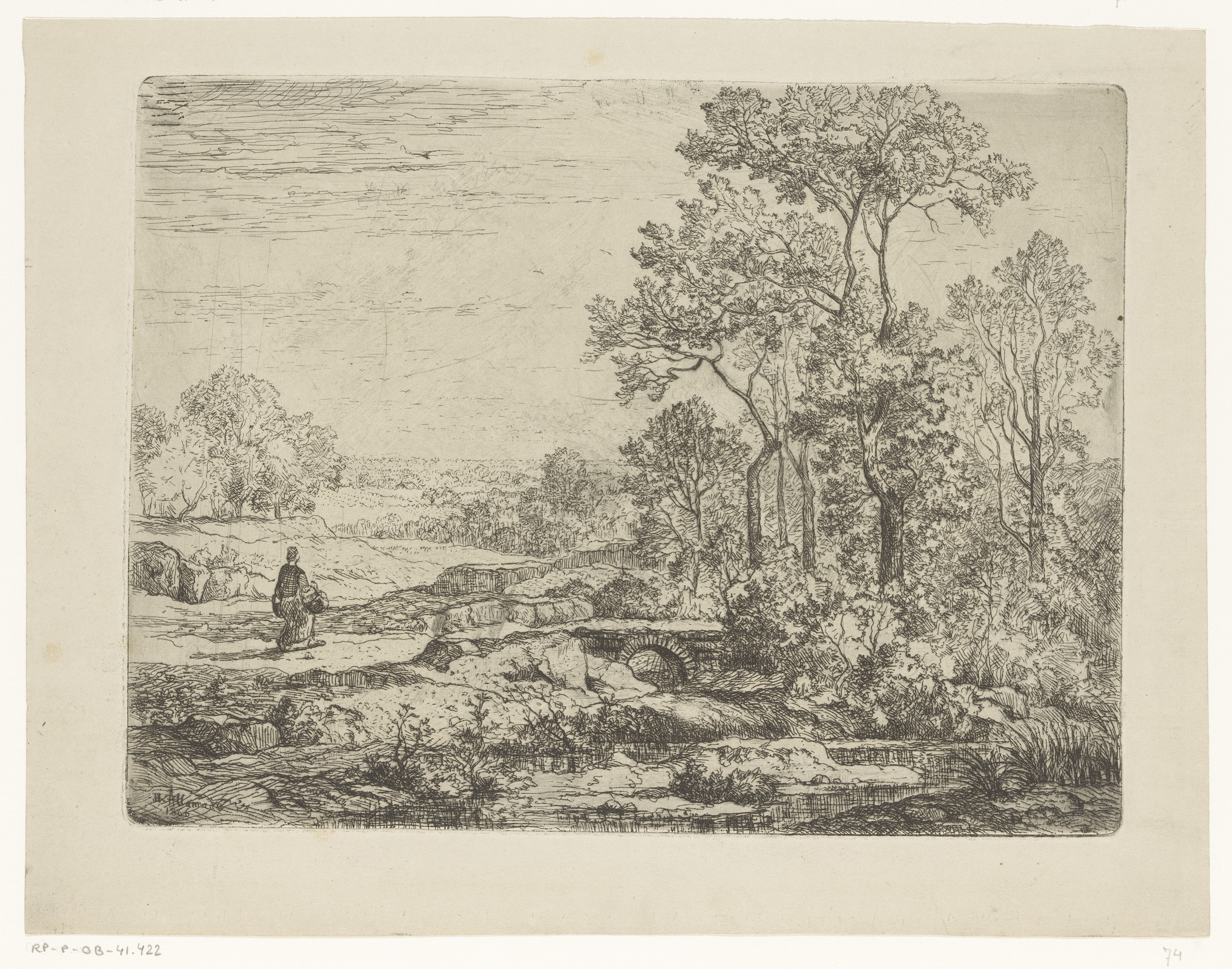 Boomrijk landschap met vrouw bij een brug