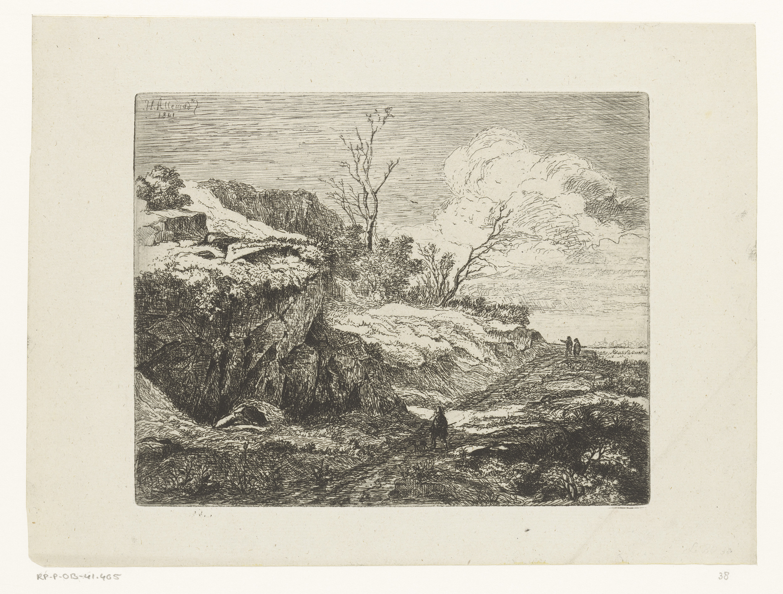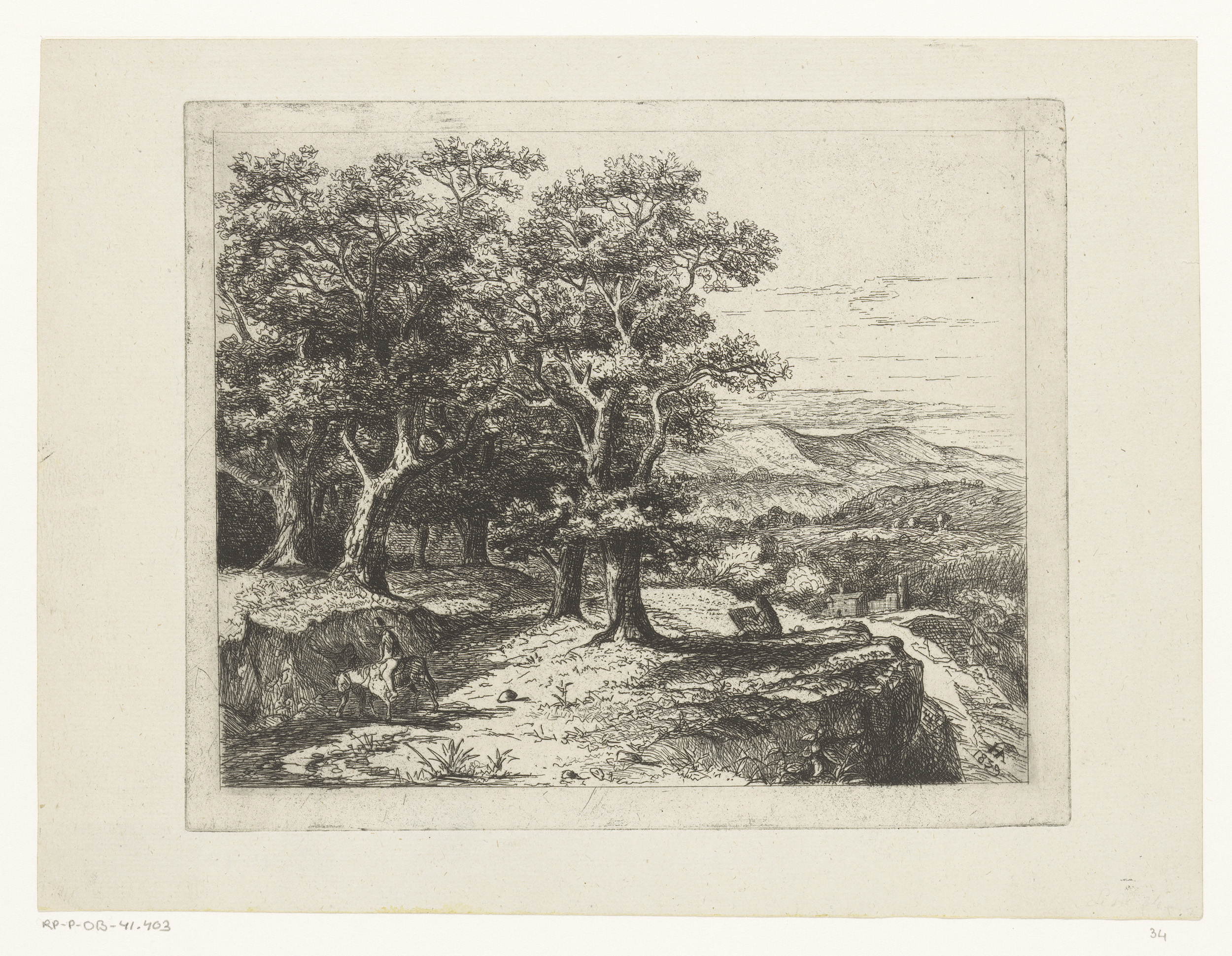 Tekenende figuur en een ruiter in heuvelachtig lands...