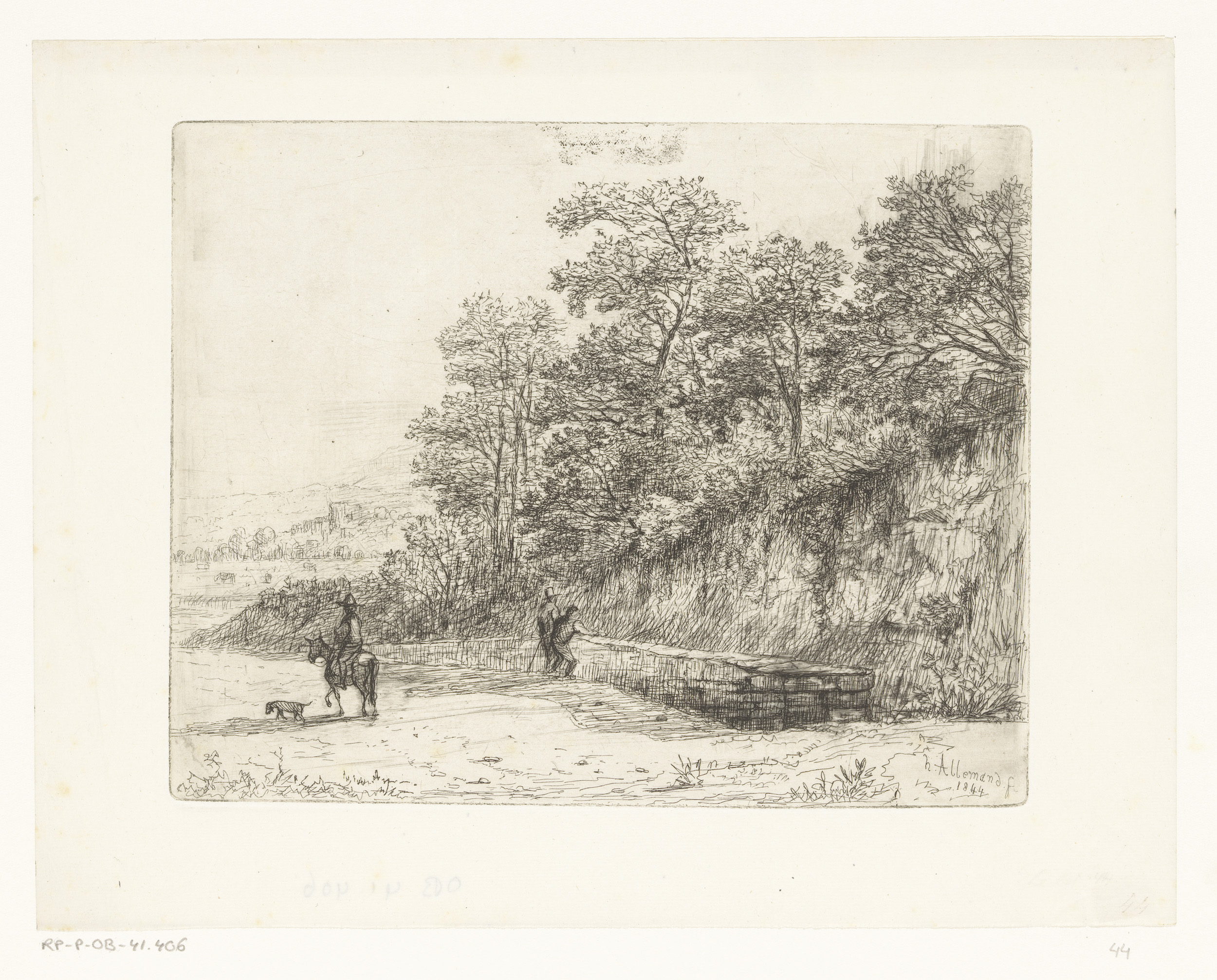 Ruiter en staande figuren bij een stenen wal