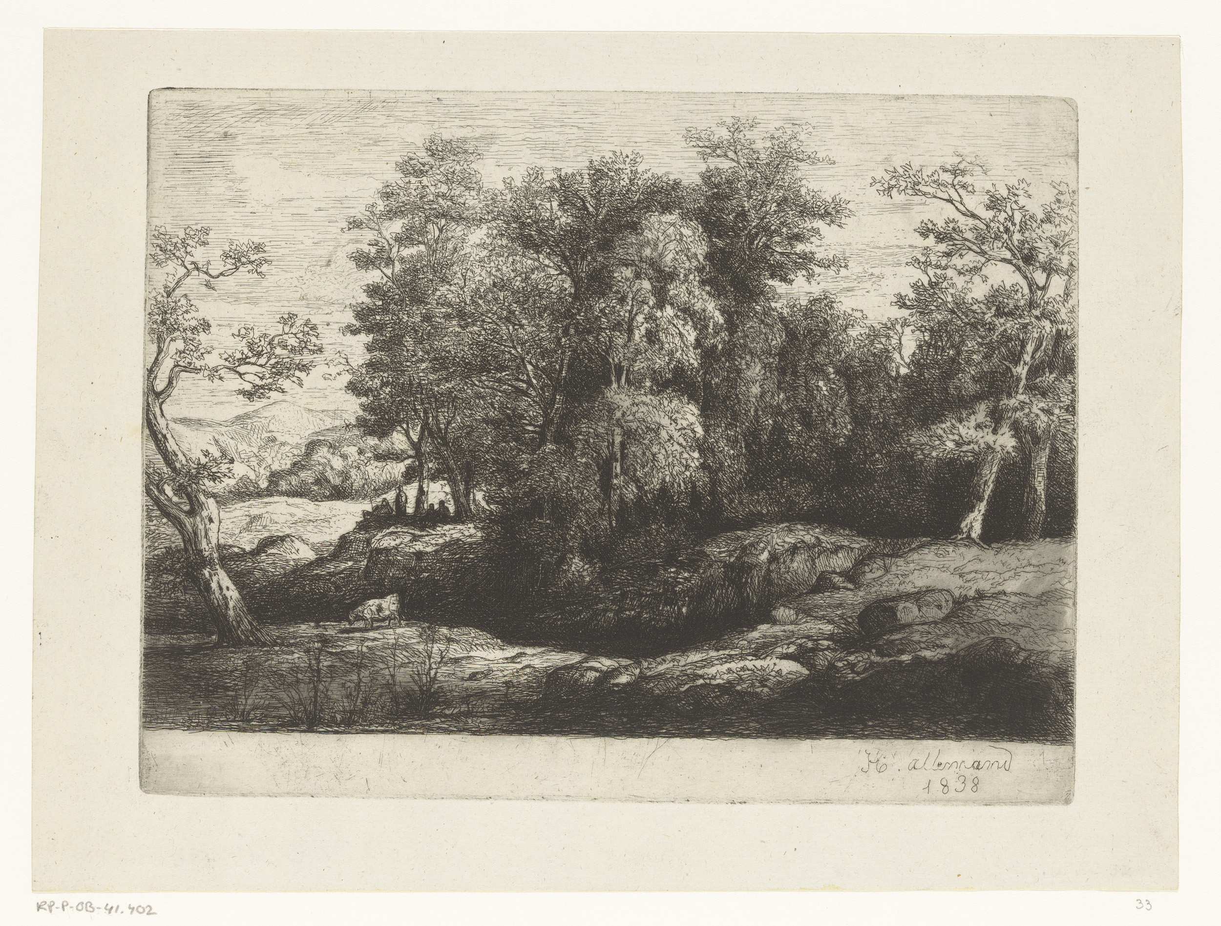 Figuren rustend onder een boom aan de rand van het bos