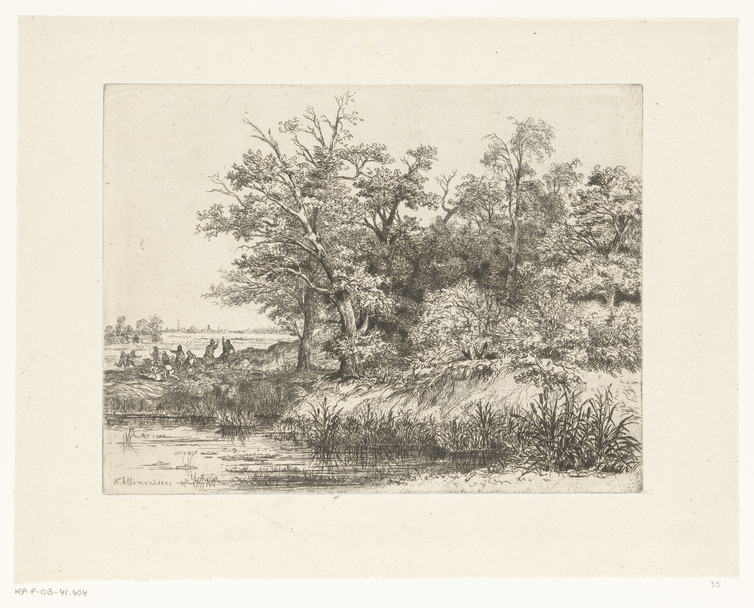 Landschap met een visser, staand in een poel