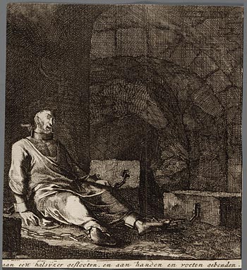 Een gevangen aan een halsijzer geslooten, en aan han...