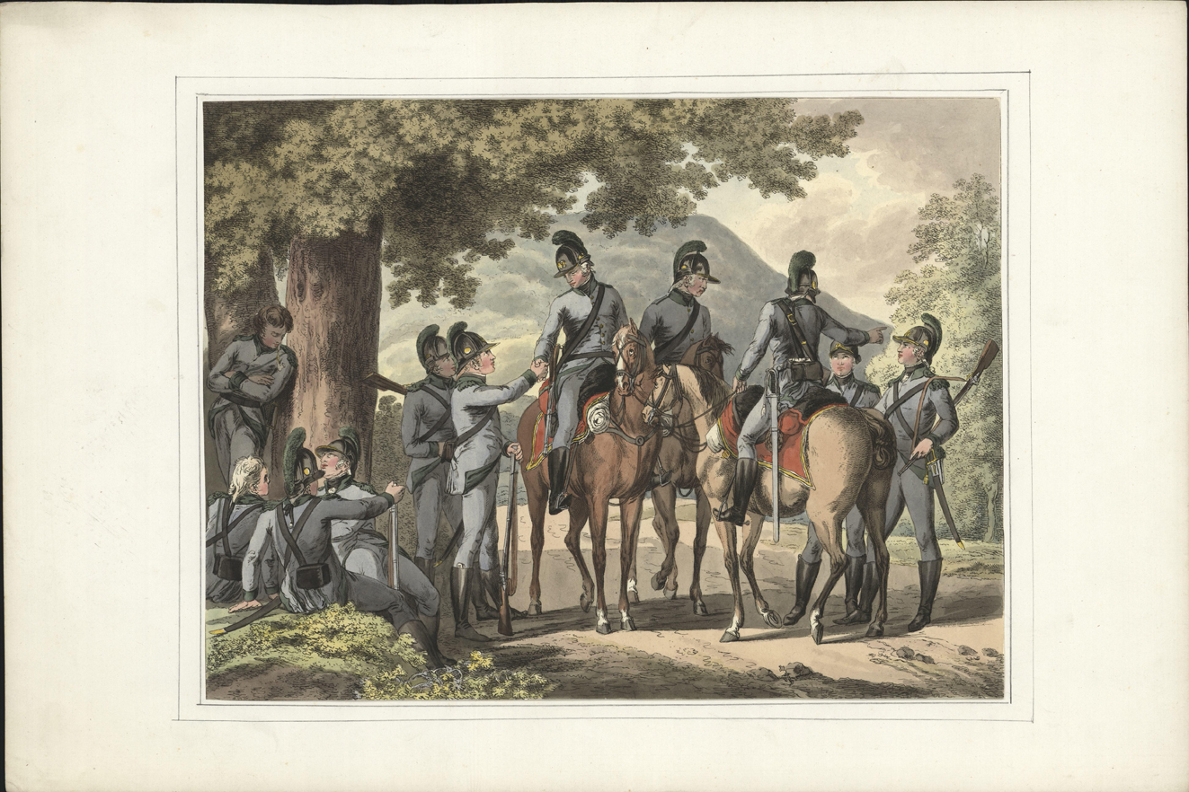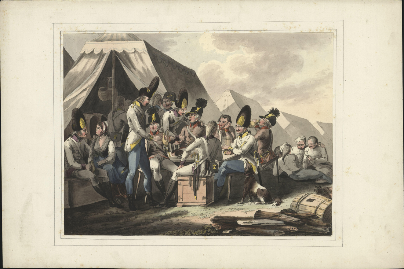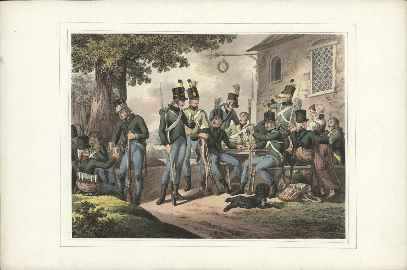 Soldaten rusten uit bij een herberg