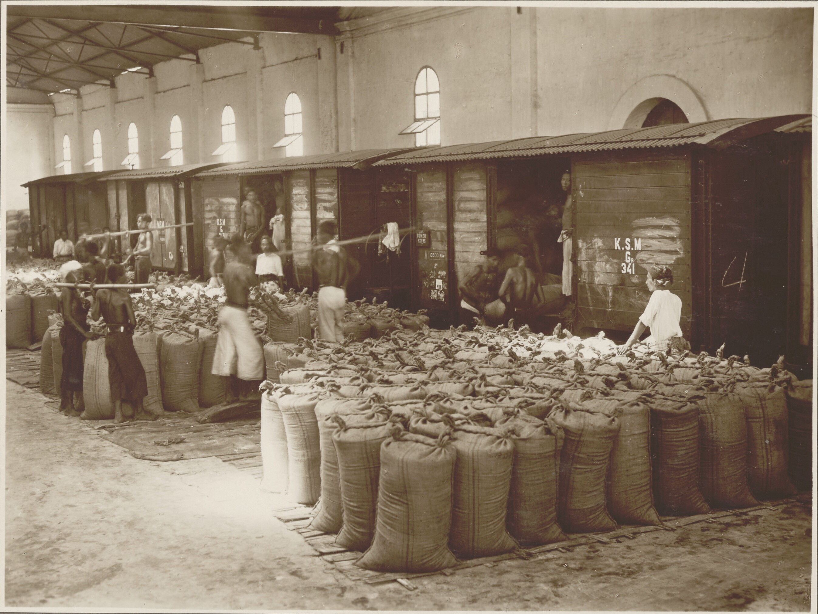 In zakken verpakte suiker wordt in treinwagons gelad...