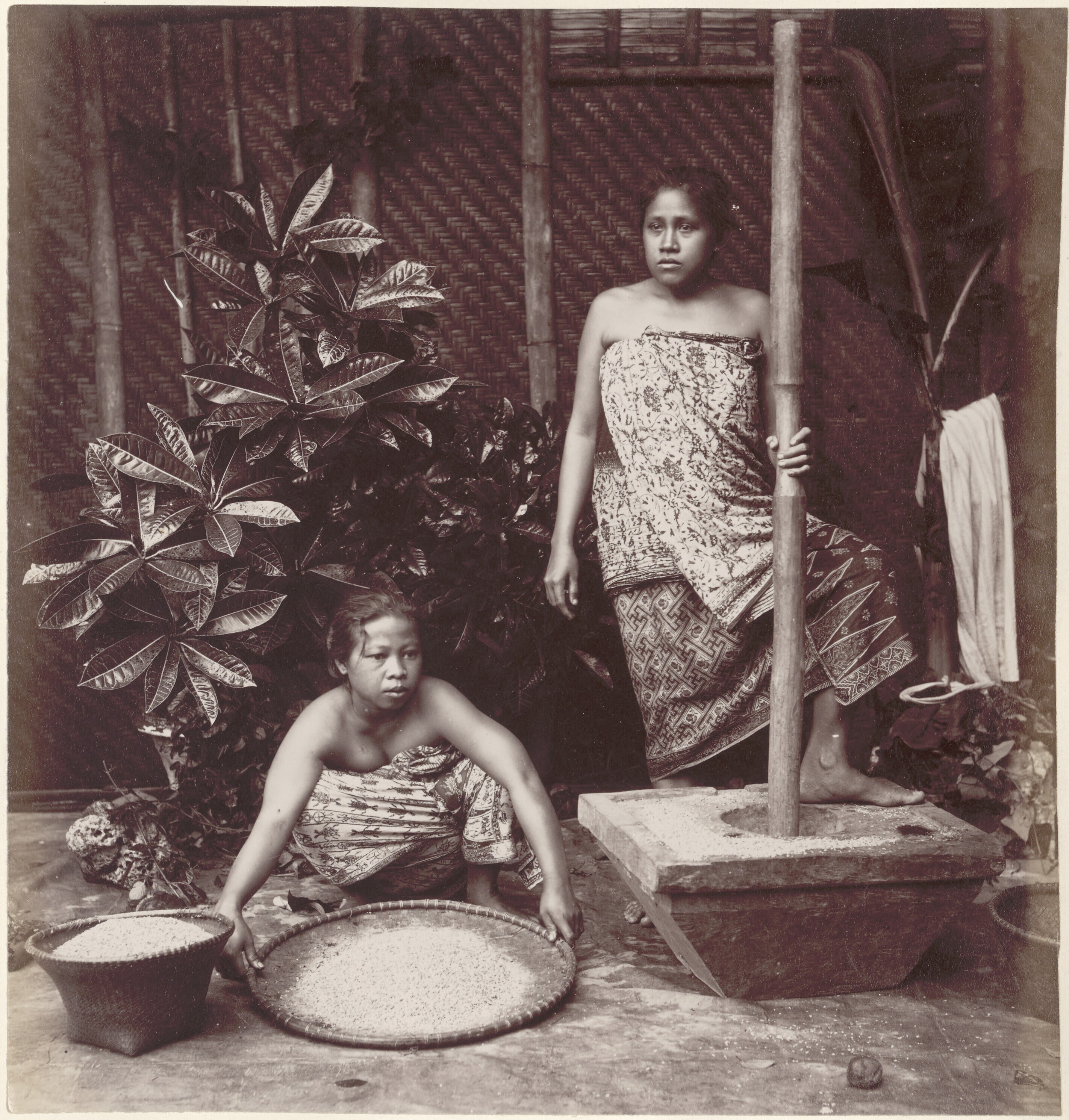 Studioportret van twee vrouwen tijdens het stampen v...