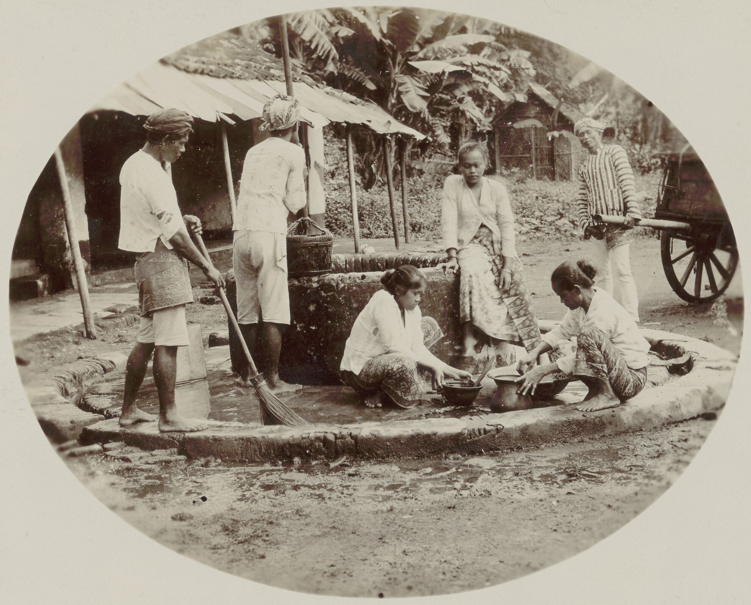 Bedrijvigheid rond een waterput bij een woonhuis in ...