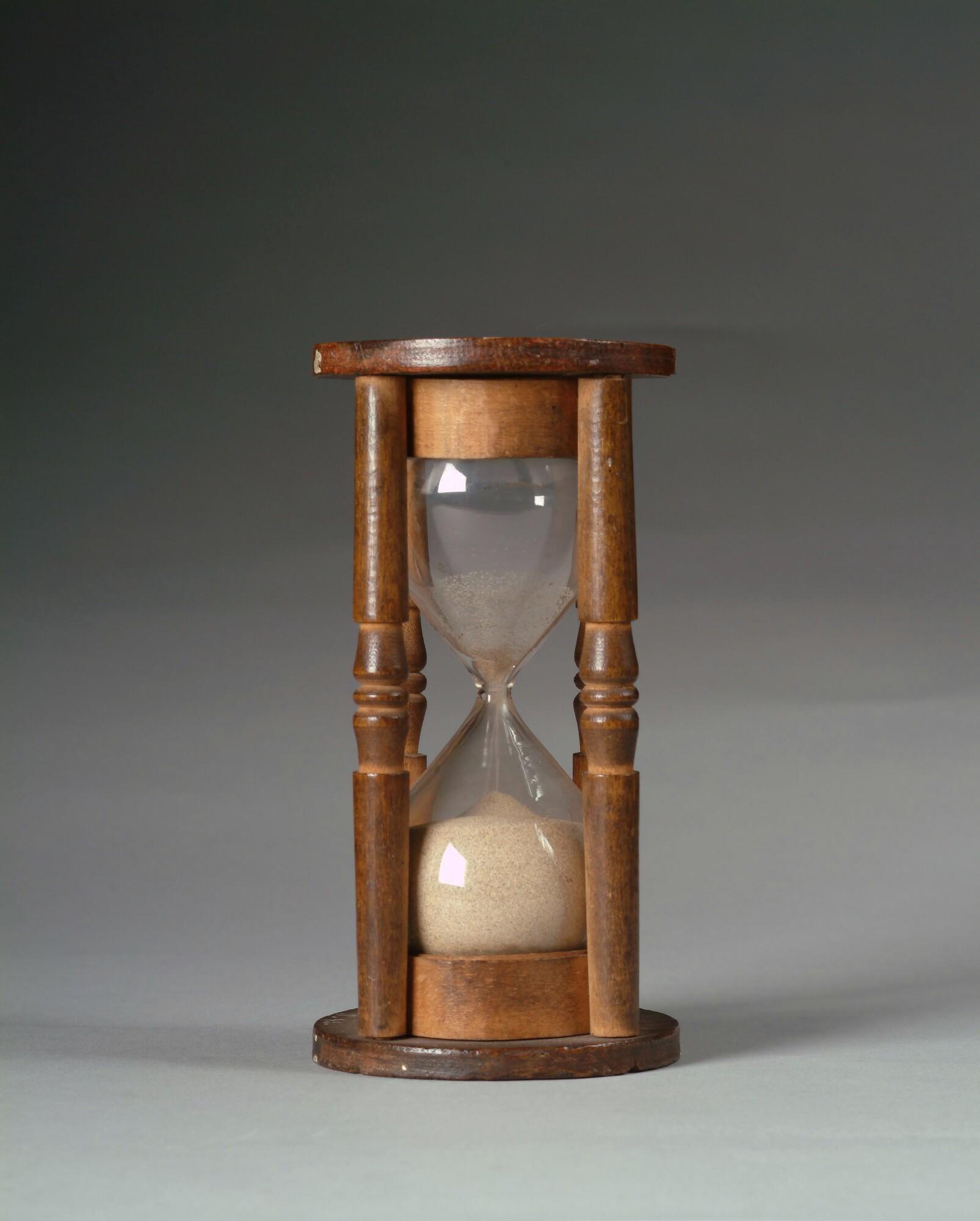 Halfuursglas, uit een stuk geblazen, in houten raam ...