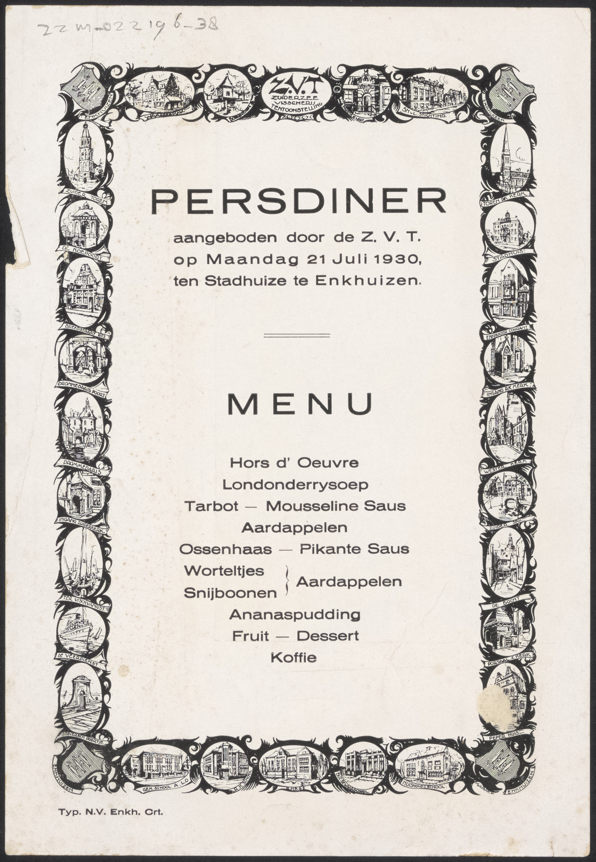Menukaart van Persdiner aangeboden door de Z.V.T. op...