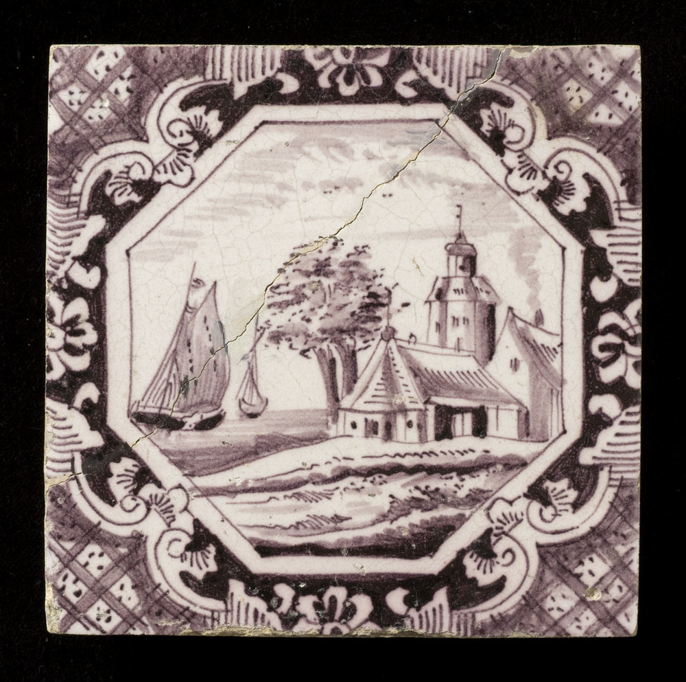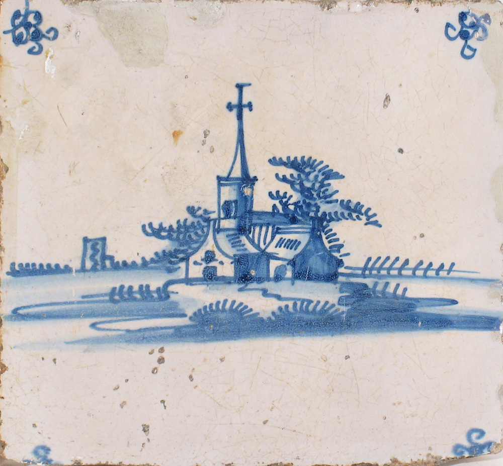 Tegel in tinglazuur, voorstellende kerkje in waterla...