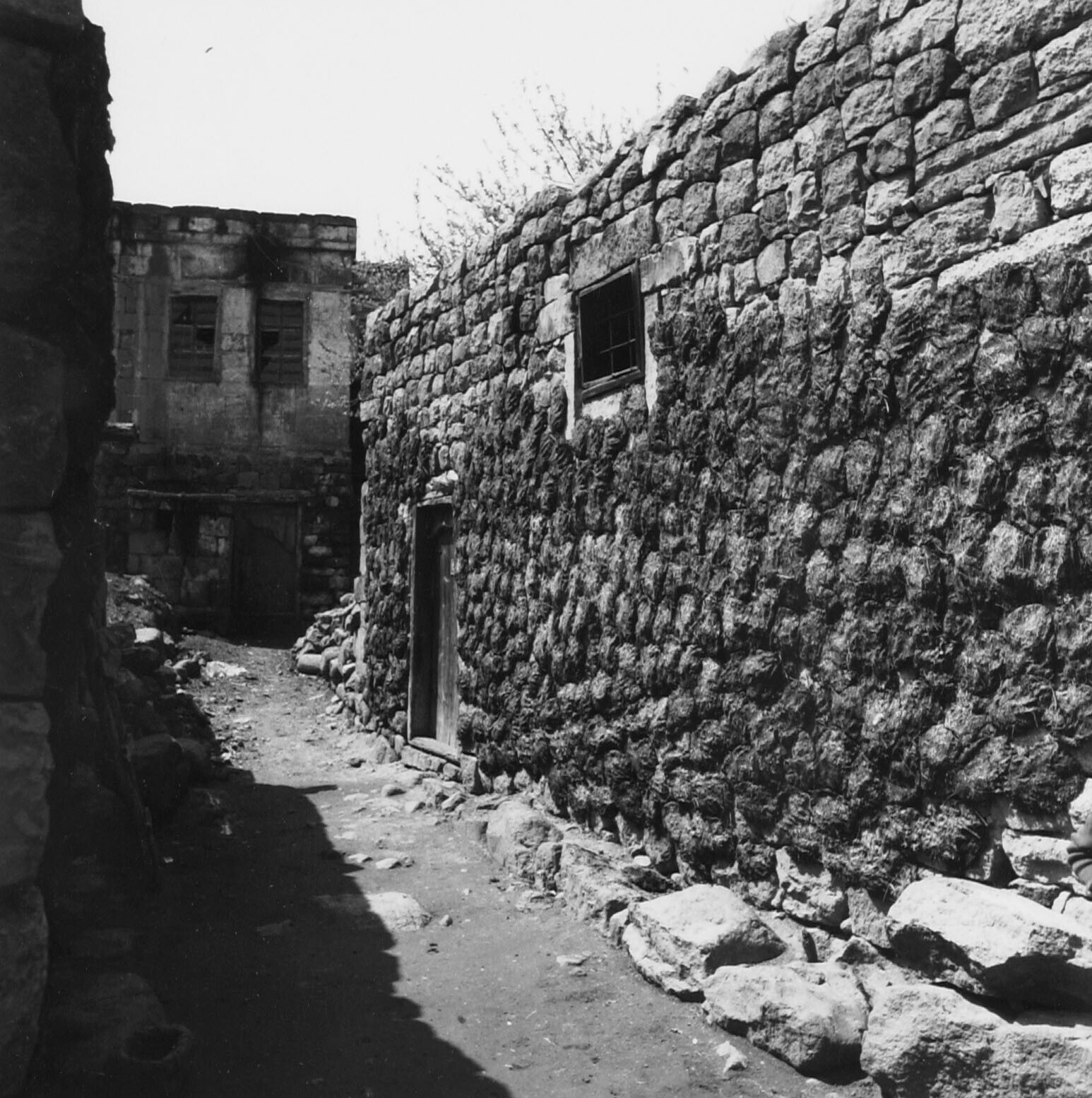 Een voorraad mestkoeken aan de muur geplakt om te dr...