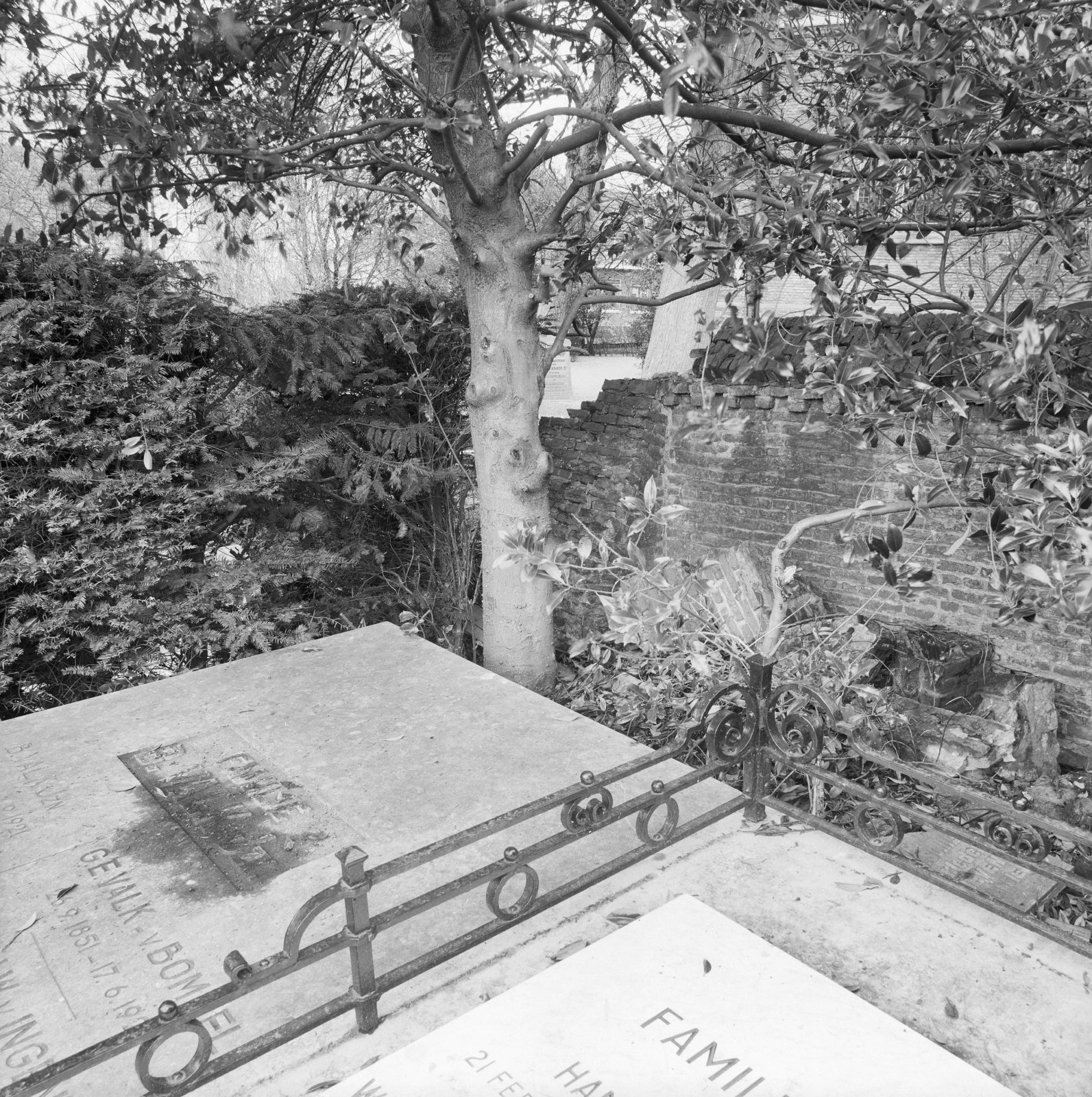 Detail kerkmuur - grafstenen op de voorgrond