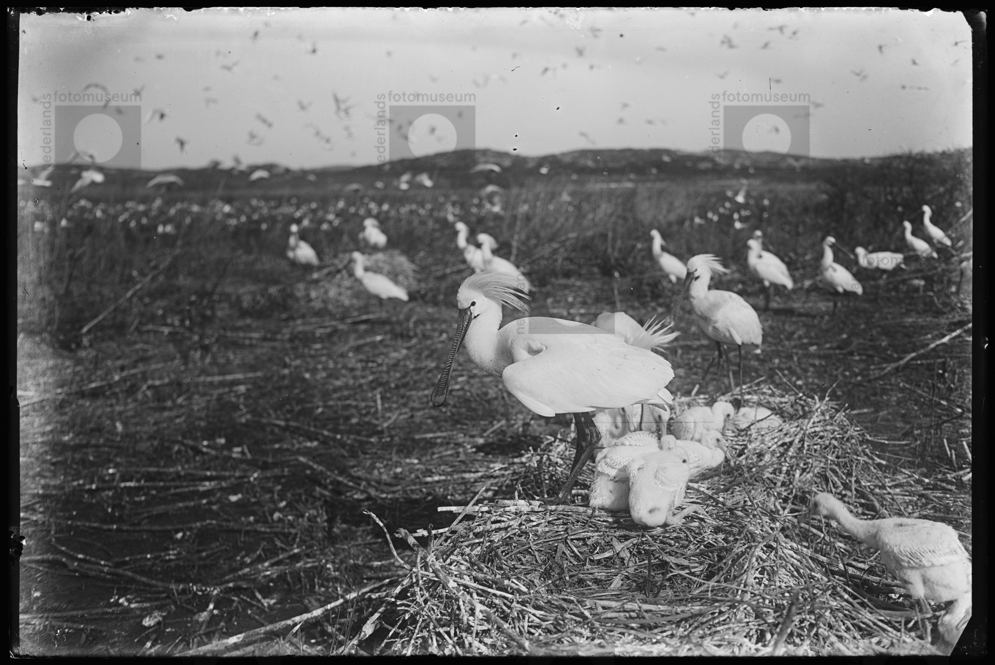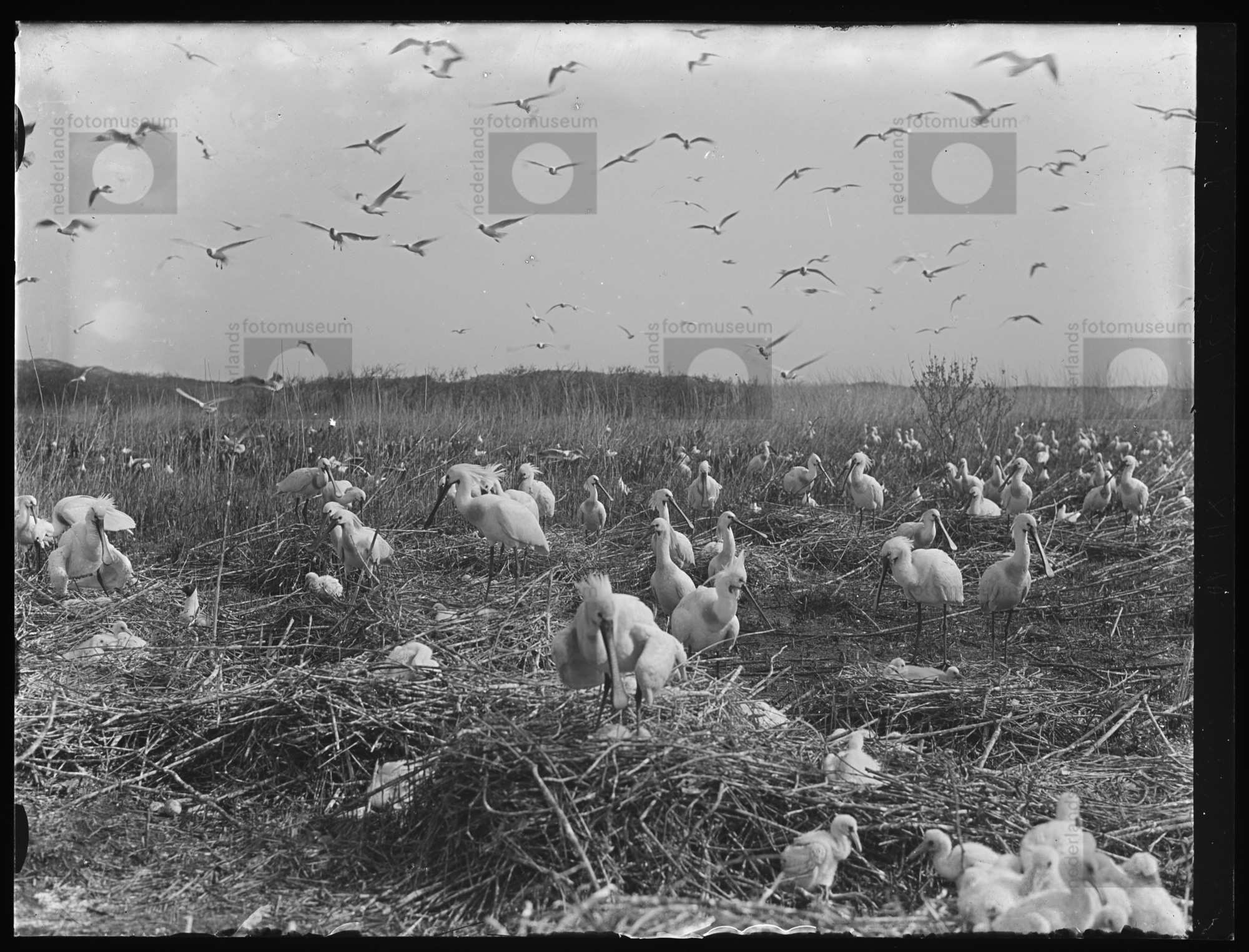 Jonge en oude Lepelaars in broedkolonie met erboven ...